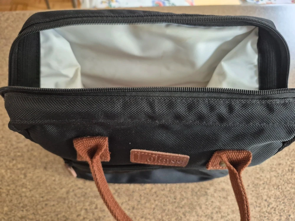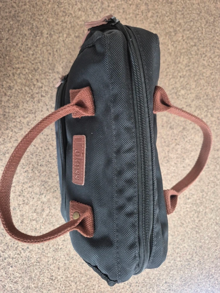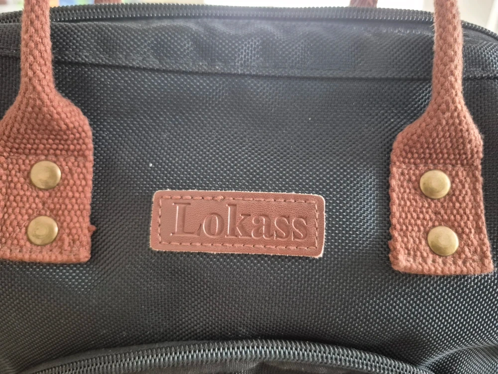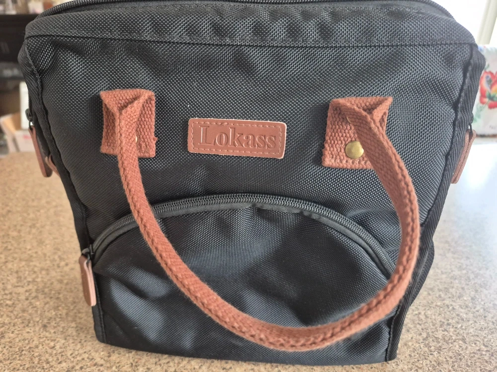 Selling a Lokass lunch bag tote in black! It's in great condition and perfect for carrying your lunch to work or school. It features brown handles and accents, and has a convenient front pocket for extra storage.