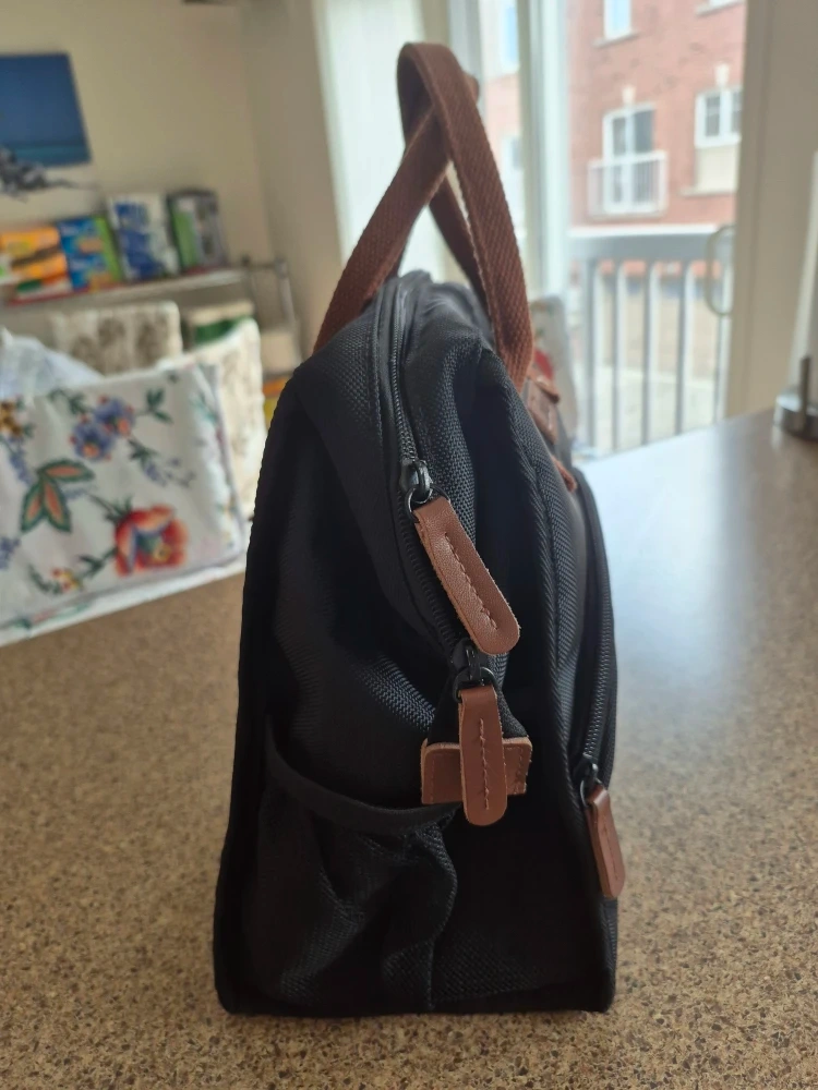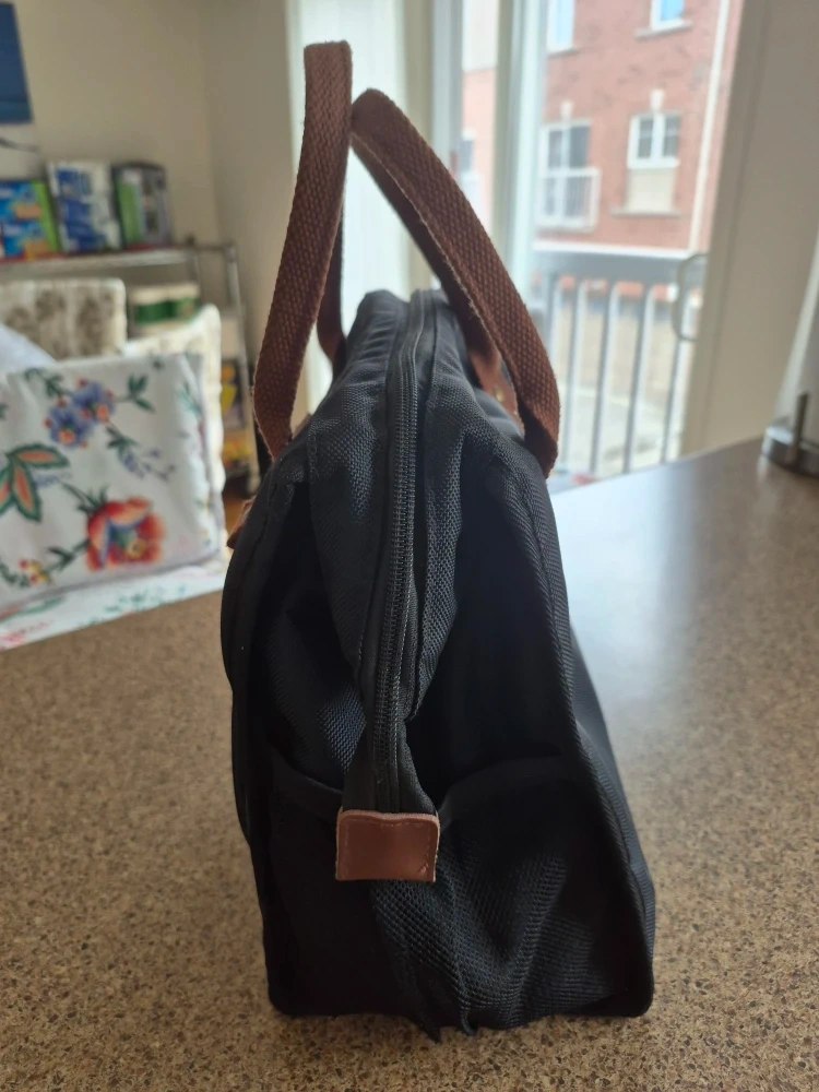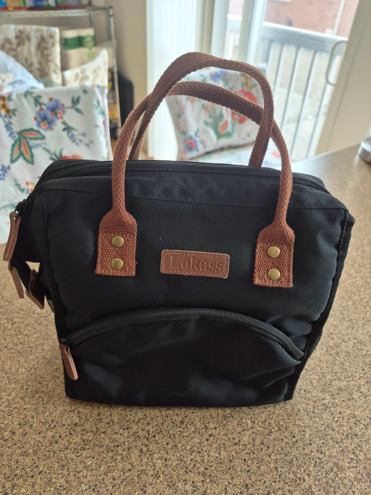 Selling a Lokass lunch bag tote in black! It's in great condition and perfect for carrying your lunch to work or school. It features brown handles and accents, and has a convenient front pocket for extra storage.