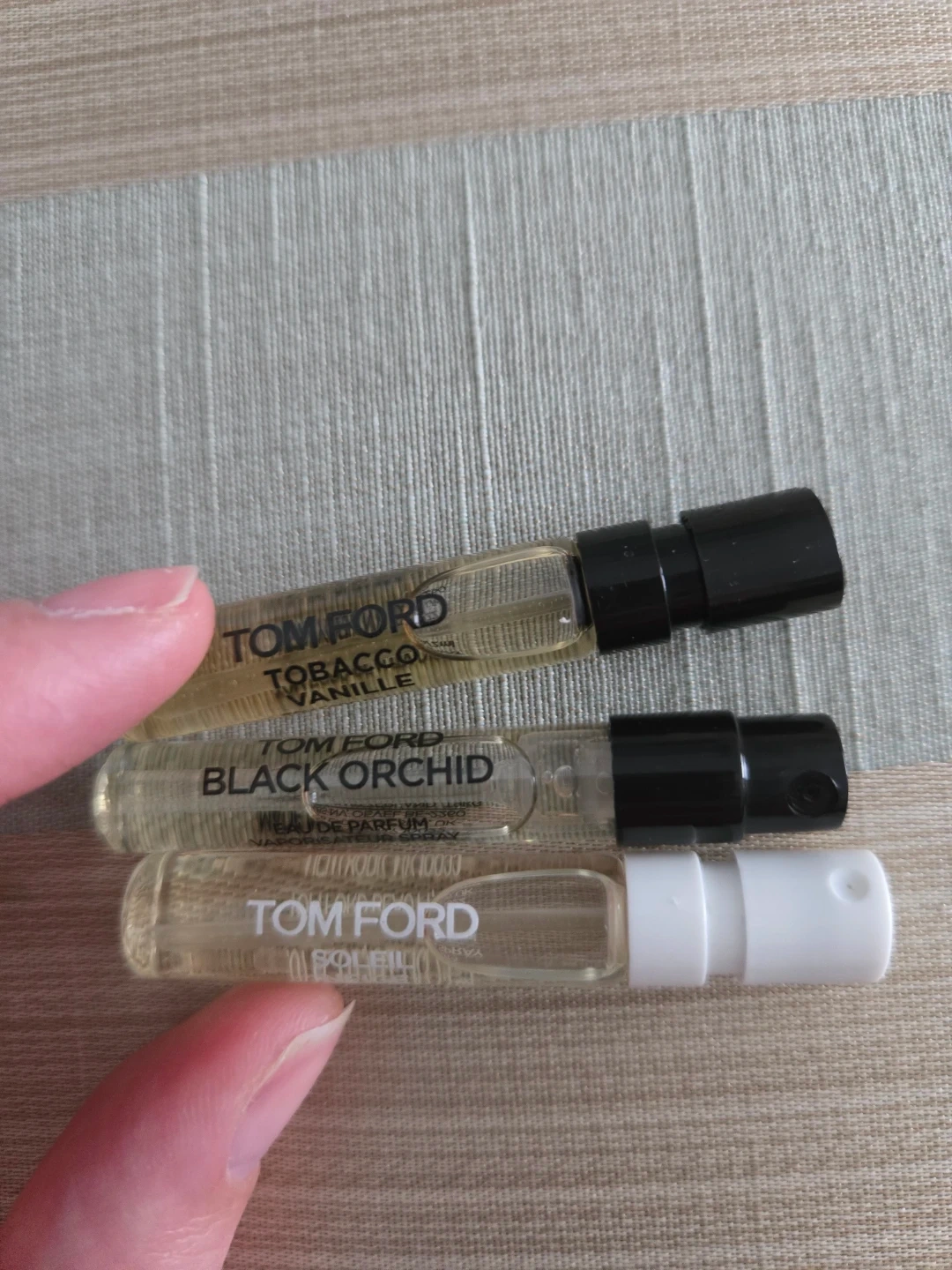 Three Tom Ford perfume samples: Tobacco Vanille, Black Orchid Eau de Parfum, and Soleil Blanc Eau de Parfum. Perfect for trying out new scents!