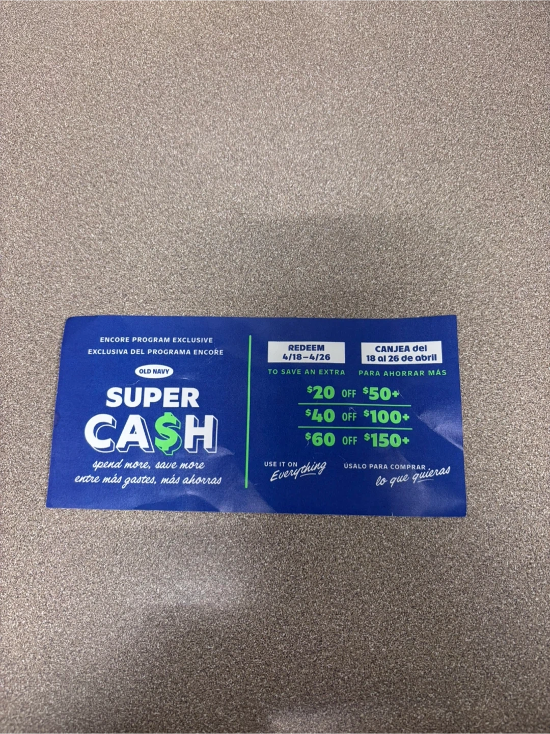 This is an Old Navy Super Cash coupon. It's redeemable from April 18th to April 26th. You can get $20 off $50+, $40 off $100+, or $60 off $150+! It can be used on everything, so shop for whatever you want.