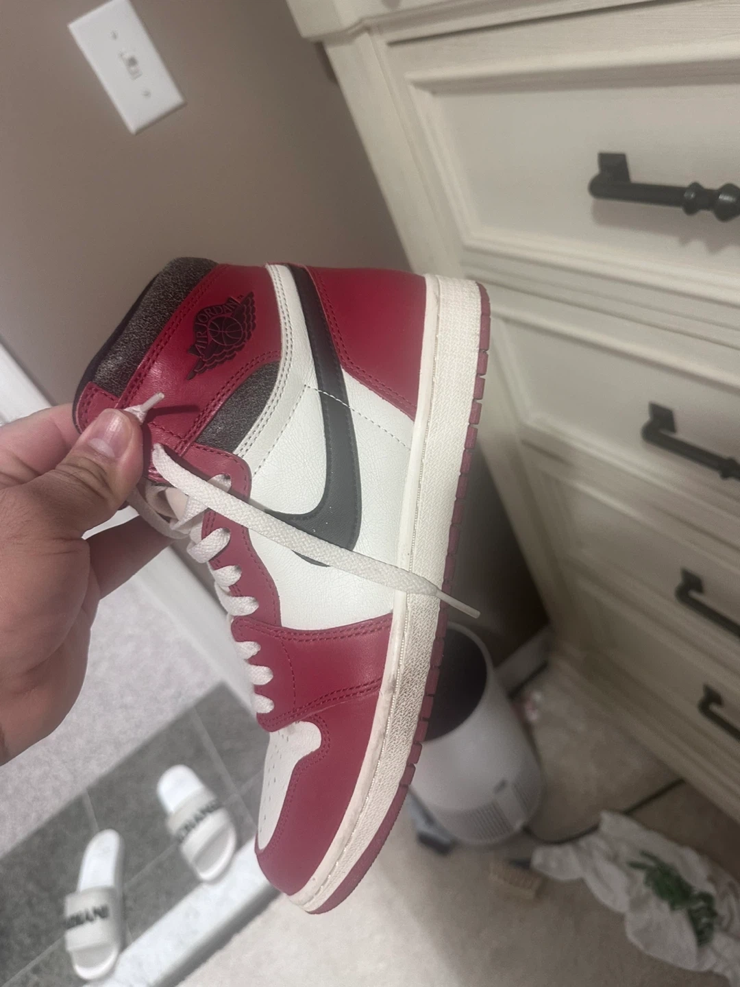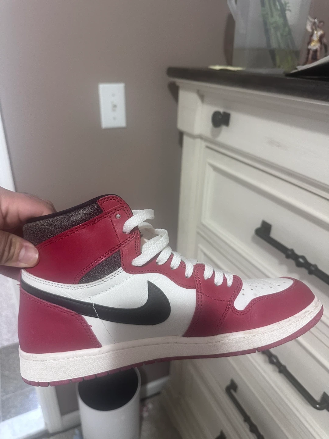 Selling a pair of Nike Air Jordan 1 High sneakers in a red and white colorway. They're in used condition, as you can see from the photos of the soles. Still a lot of life left in them!