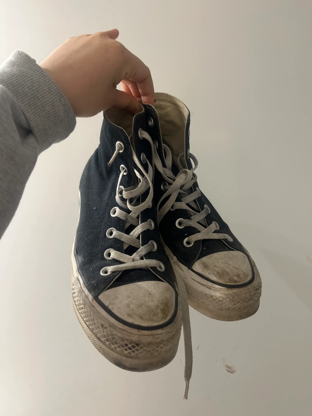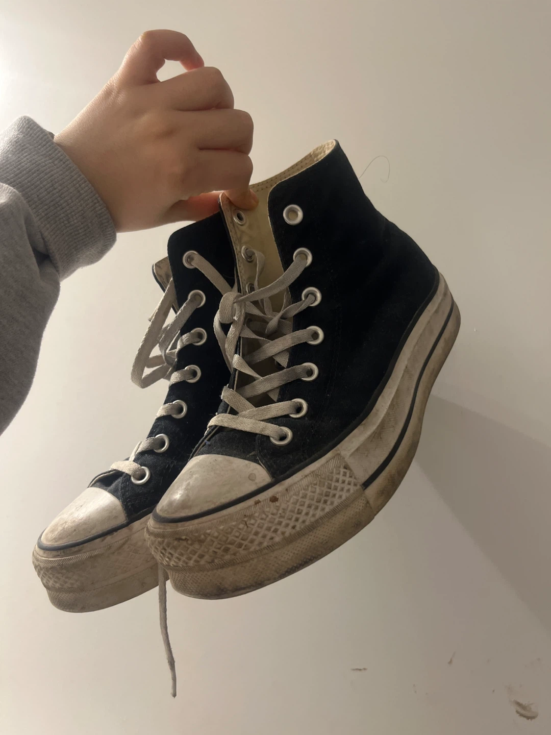 These black Converse Chuck Taylor All Star platform high top sneakers are a classic choice. They're made of canvas with a rubber sole. Some scuffing is visible on the soles and toe caps from regular wear. These are a great pair for everyday wear!
