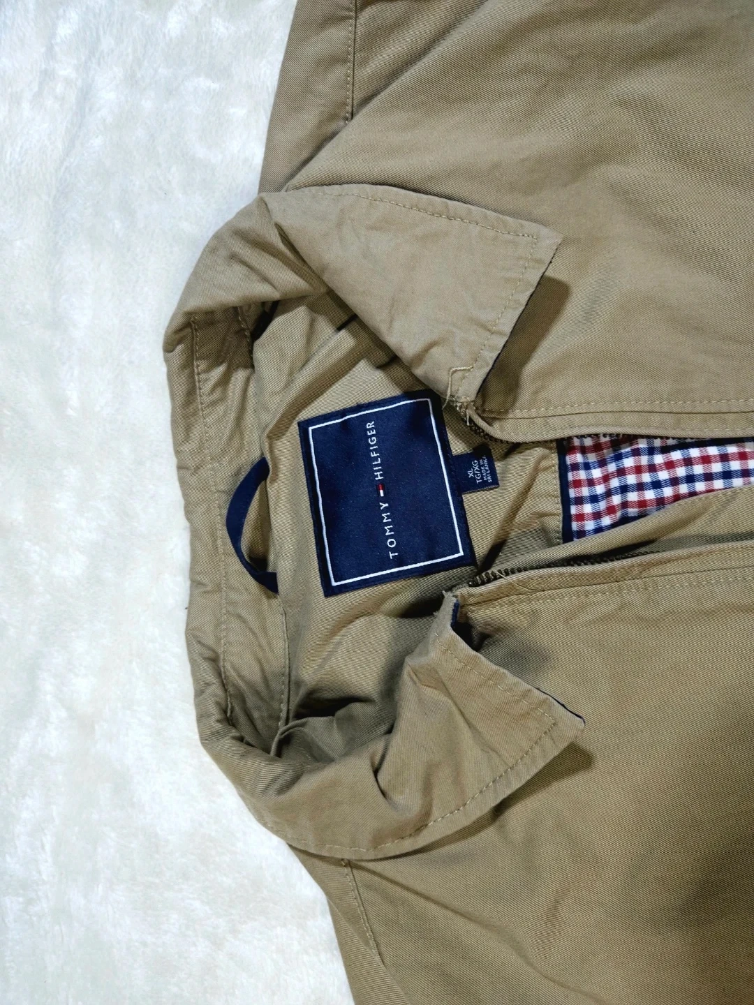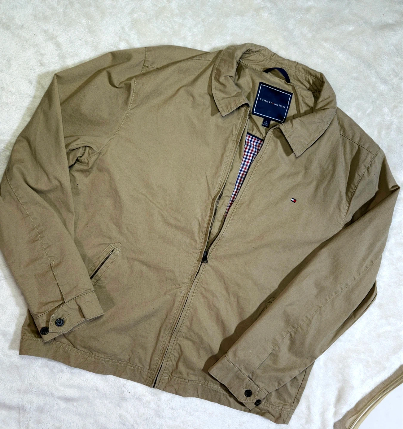 This Tommy Hilfiger jacket comes in a classic khaki colour. It's made from a durable material and features a full-zip closure. The interior lining has a red and white checkered pattern.