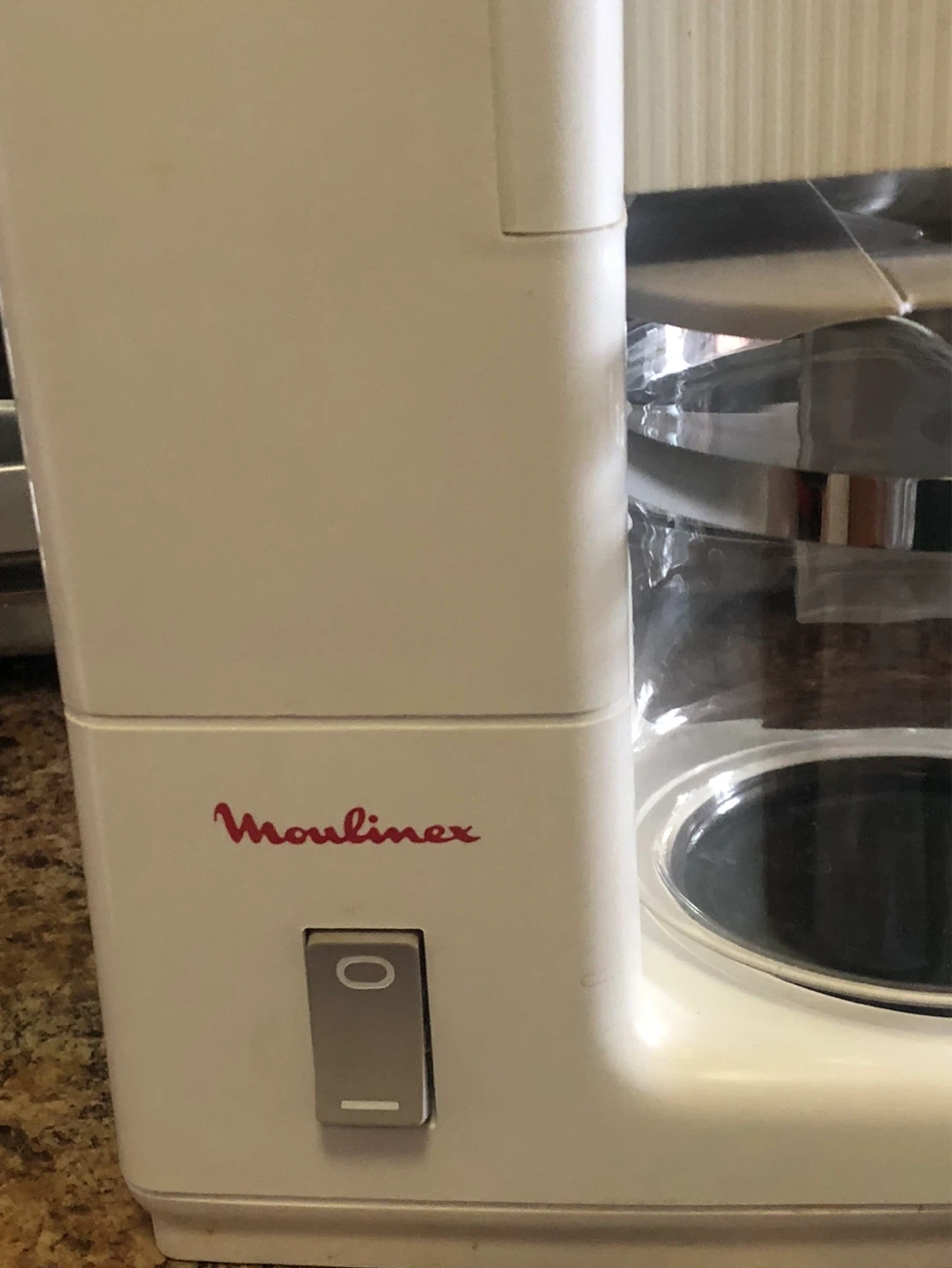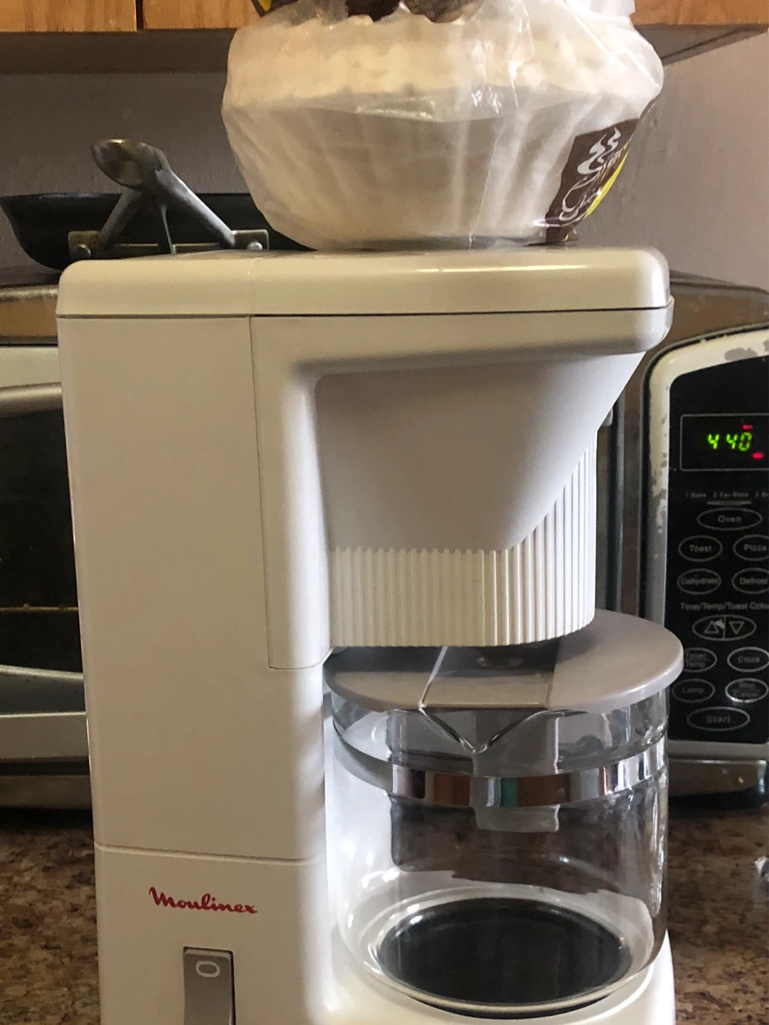This is a white Moulinex coffee maker. It comes with a glass carafe and includes a bag of coffee filters. Perfect for making your morning coffee!