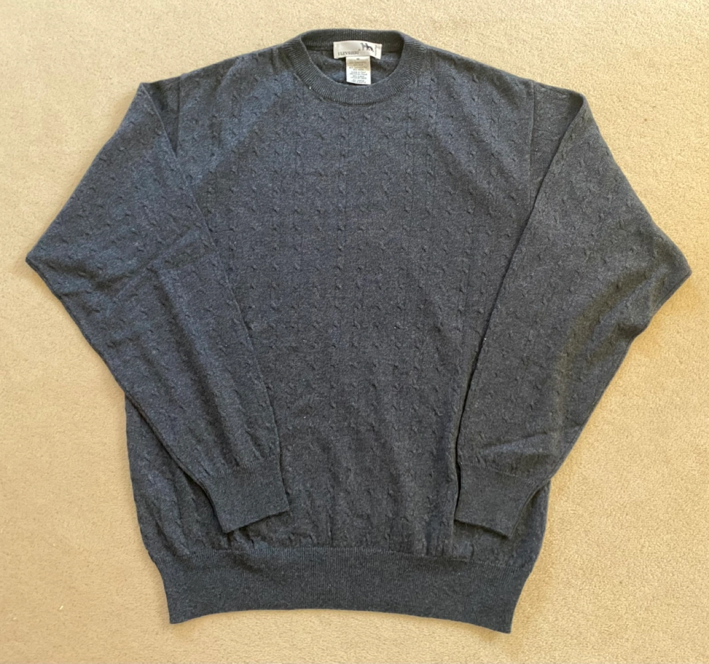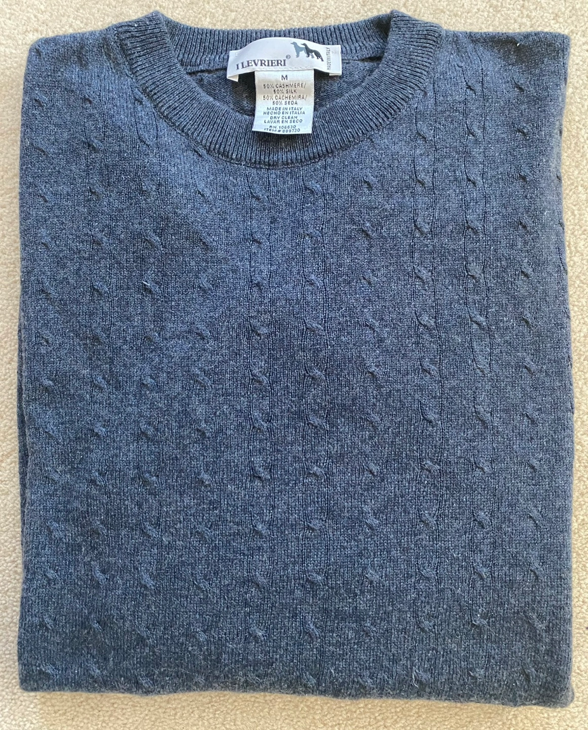 Grey men's sweater, size medium. 50% cashmere, 50% silk. Made in Italy. Dry clean only. Cable knit pattern. Long sleeves, crew neck.