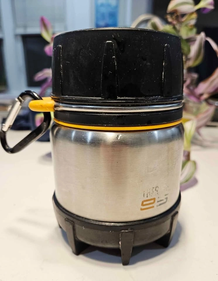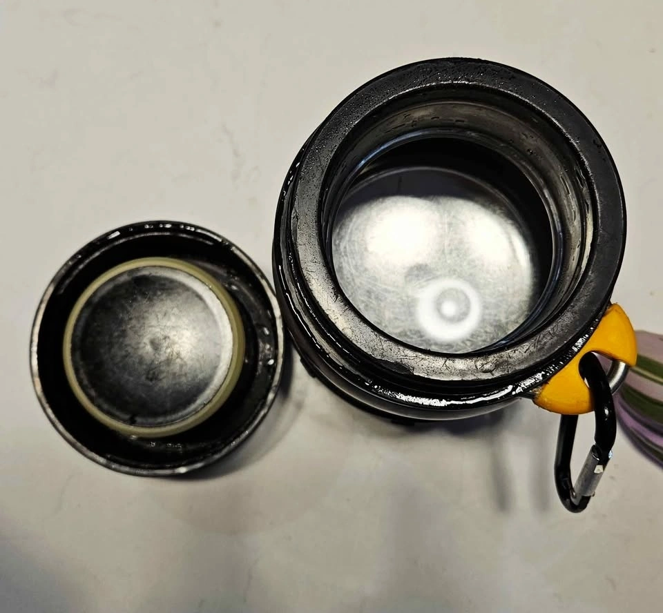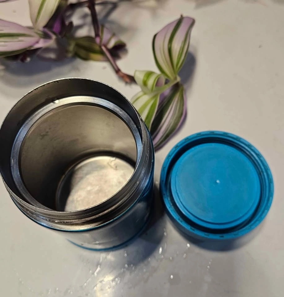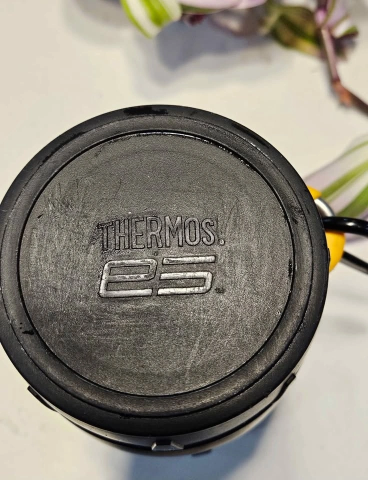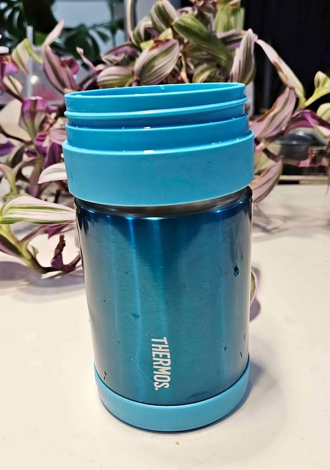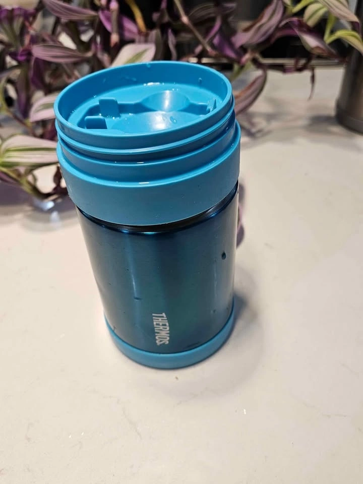Here are two Thermos food jars. The blue one is missing its lid. The black one is an older model and shows some wear and tear. I'll include these for free if you buy any of my other items.