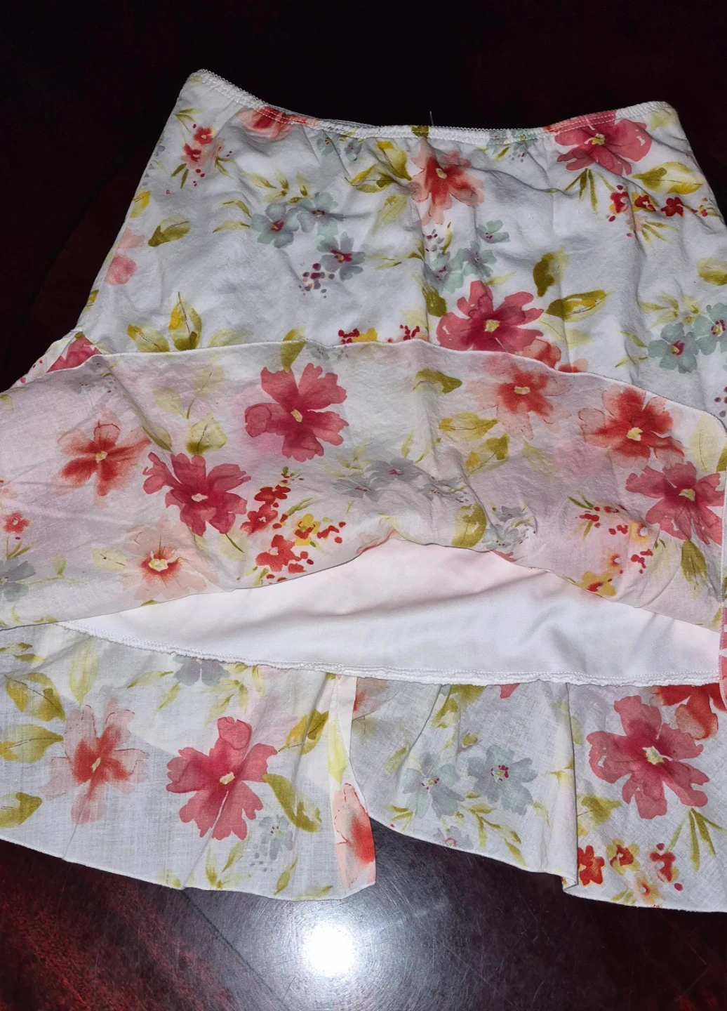 This floral flirty skirt is made with 100% cotton and a polyester lining. It's a size medium. Handwash cold.