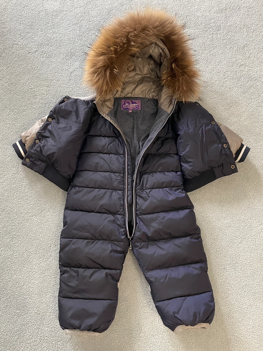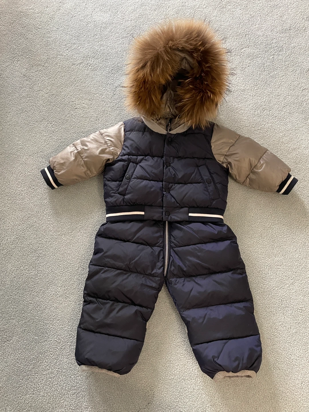 Warm puffer snowsuit with a removable fur-lined hood. Features a full zip front and a comfortable fit. Perfect for keeping your little one toasty during winter.