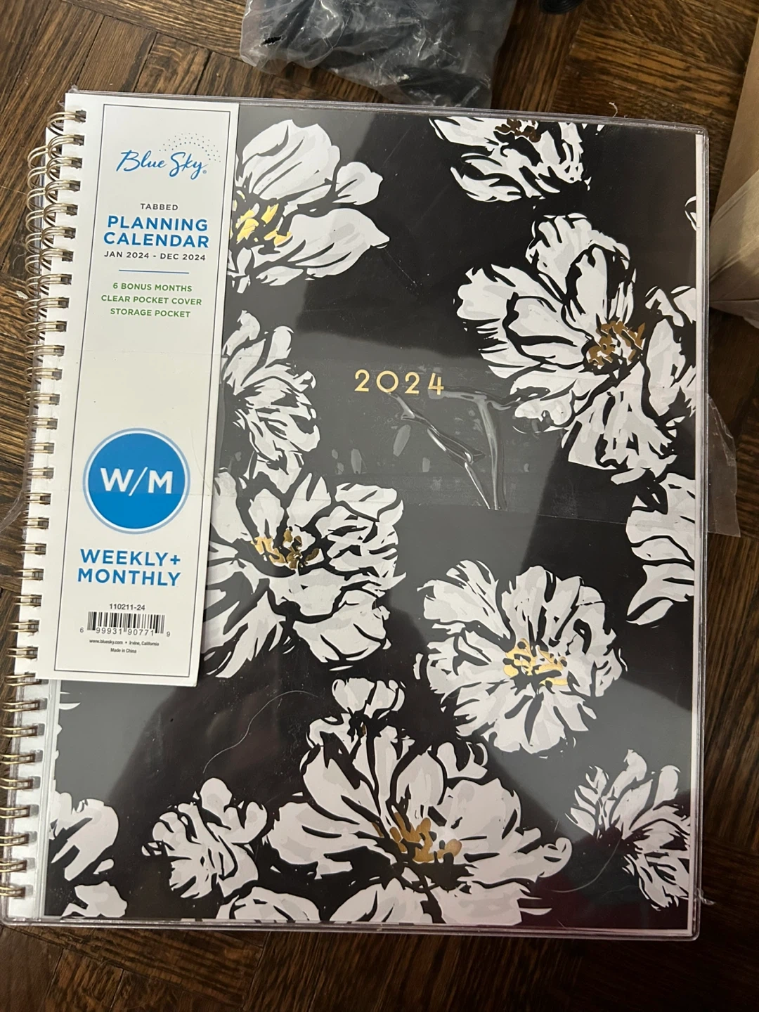 Free This Blue Sky planning calendar covers Jan 2024 - Dec 2024 with 6 bonus months. It features a weekly and monthly layout, a clear pocket cover, and a storage pocket. It's spiral-bound for easy page turning.