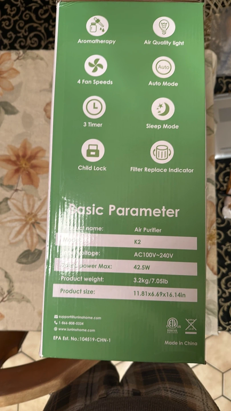 LUNINE K2 Air Purifier. Features aromatherapy, air quality light, 4 fan speeds, auto mode, 3 timers, and sleep mode. Includes child lock and filter replace indicator. Measures 11.81x6.69x16.14in and weighs 3.2kg/7.05lb.