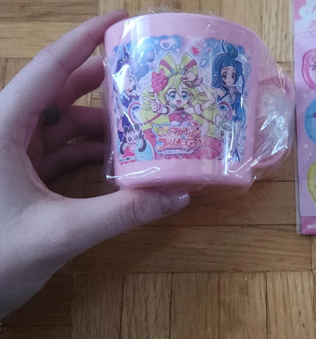 This mini pink plastic mug features characters from "Pretty Cure". This mug is suitable for kids or collectors. Set includes six puffy Pretty Cure Stickers. Both new, sealed, never used.