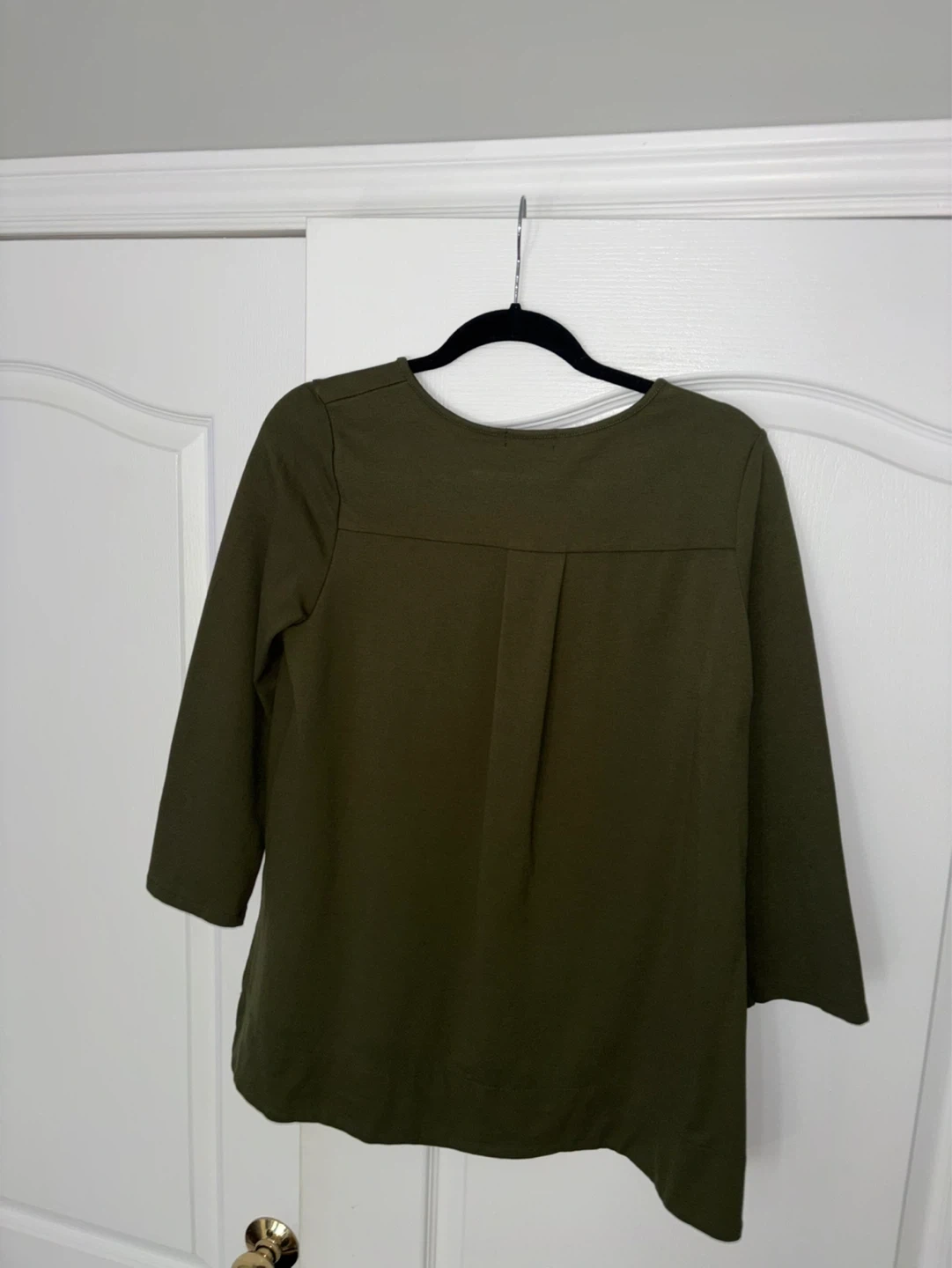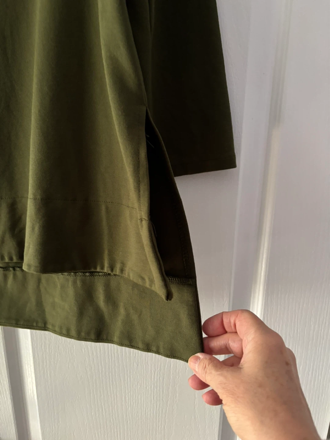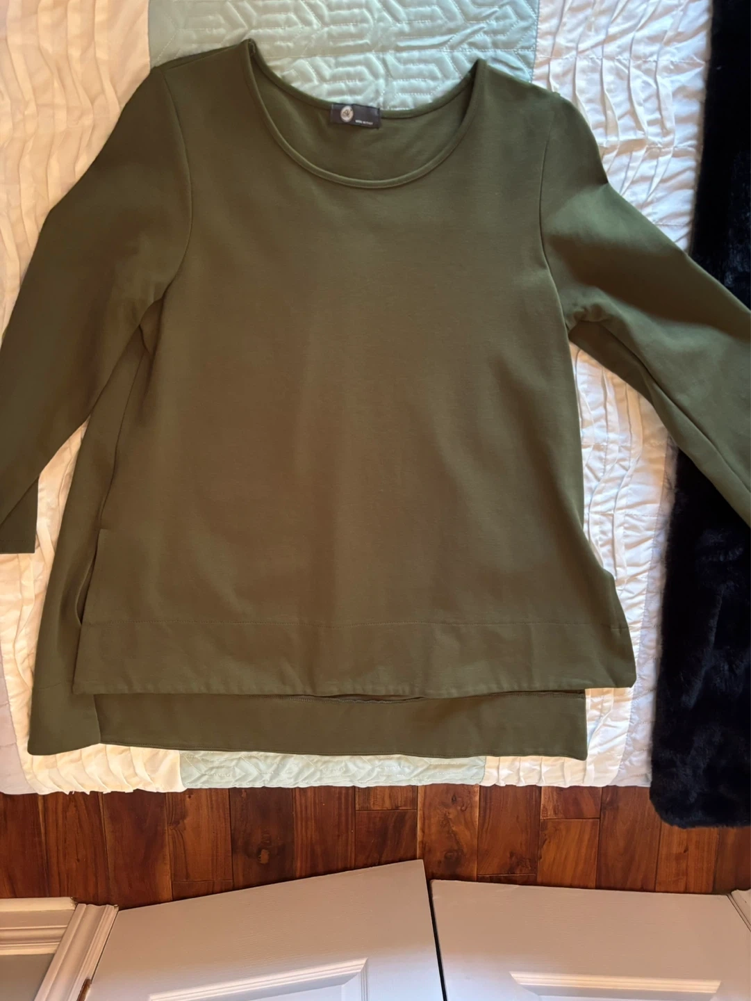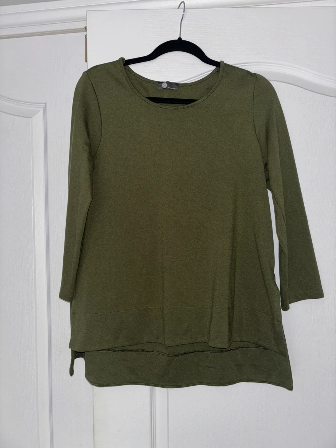 M Made in Italy comfortable olive green tunic top with a relaxed fit. Features a crew neckline and 3/4 sleeves for easy layering. Smooth fabric with a subtle high-low hem adds polish. Versatile olive color pairs well with jeans or tailored pants. In perfect condition. It is a beautiful green colour so I tried my best to include multiple pictures, but still doesn’t capture the exact shade.