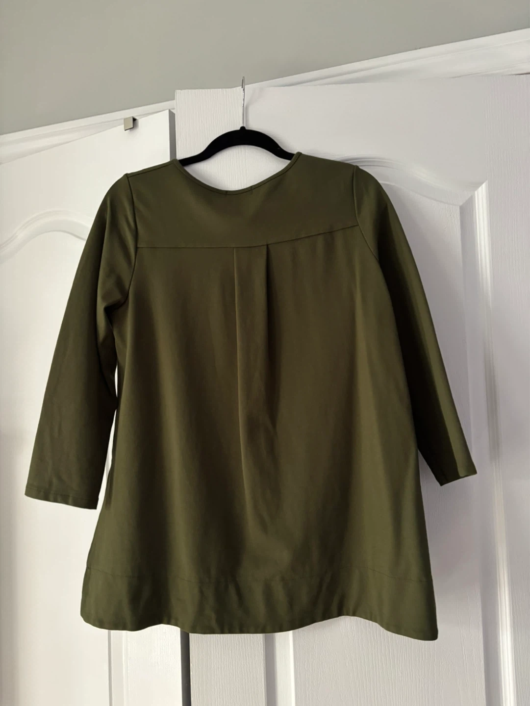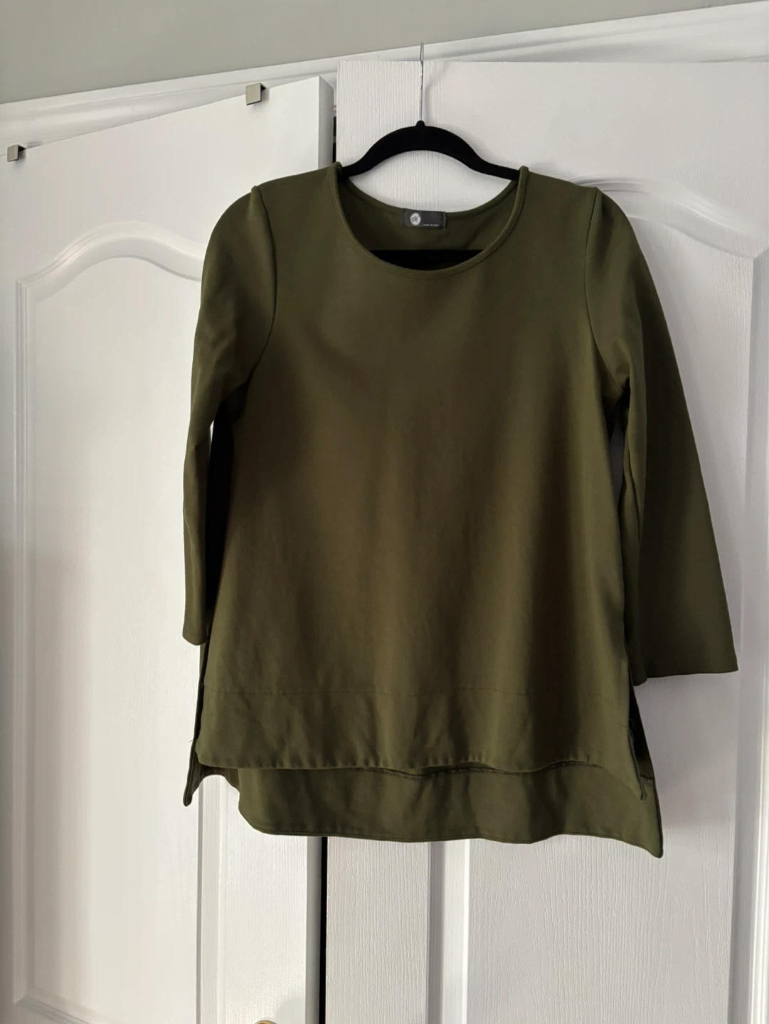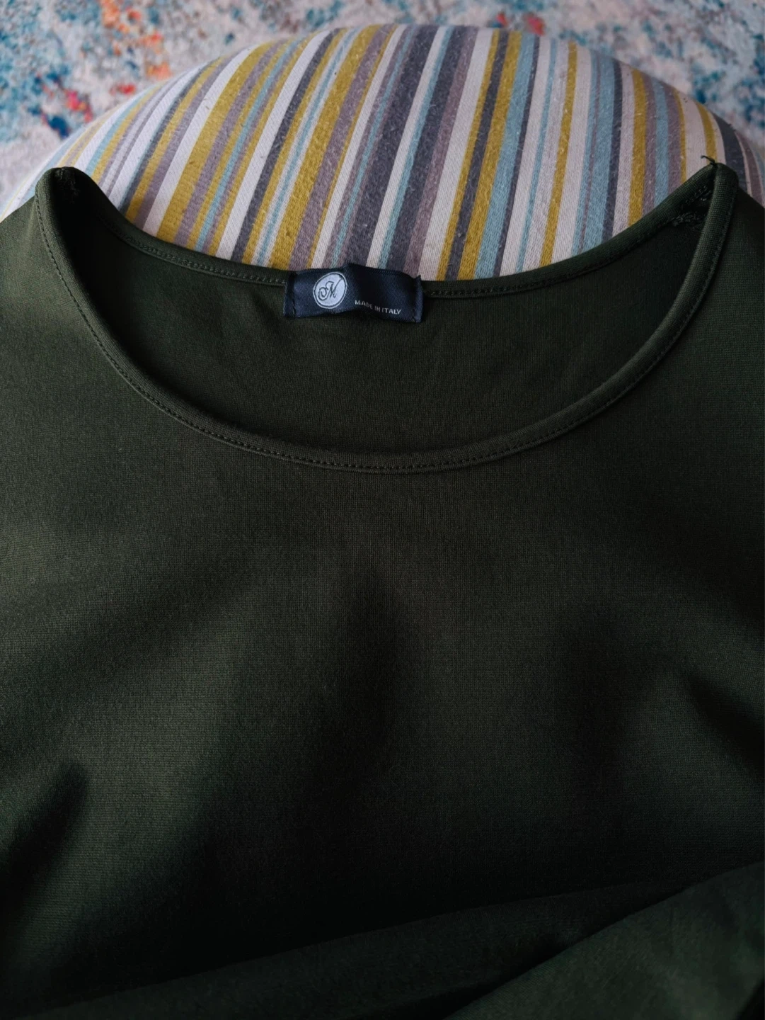 M Made in Italy comfortable olive green tunic top with a relaxed fit. Features a crew neckline and 3/4 sleeves for easy layering. Smooth fabric with a subtle high-low hem adds polish. Versatile olive color pairs well with jeans or tailored pants. In perfect condition. It is a beautiful green colour so I tried my best to include multiple pictures, but still doesn’t capture the exact shade.