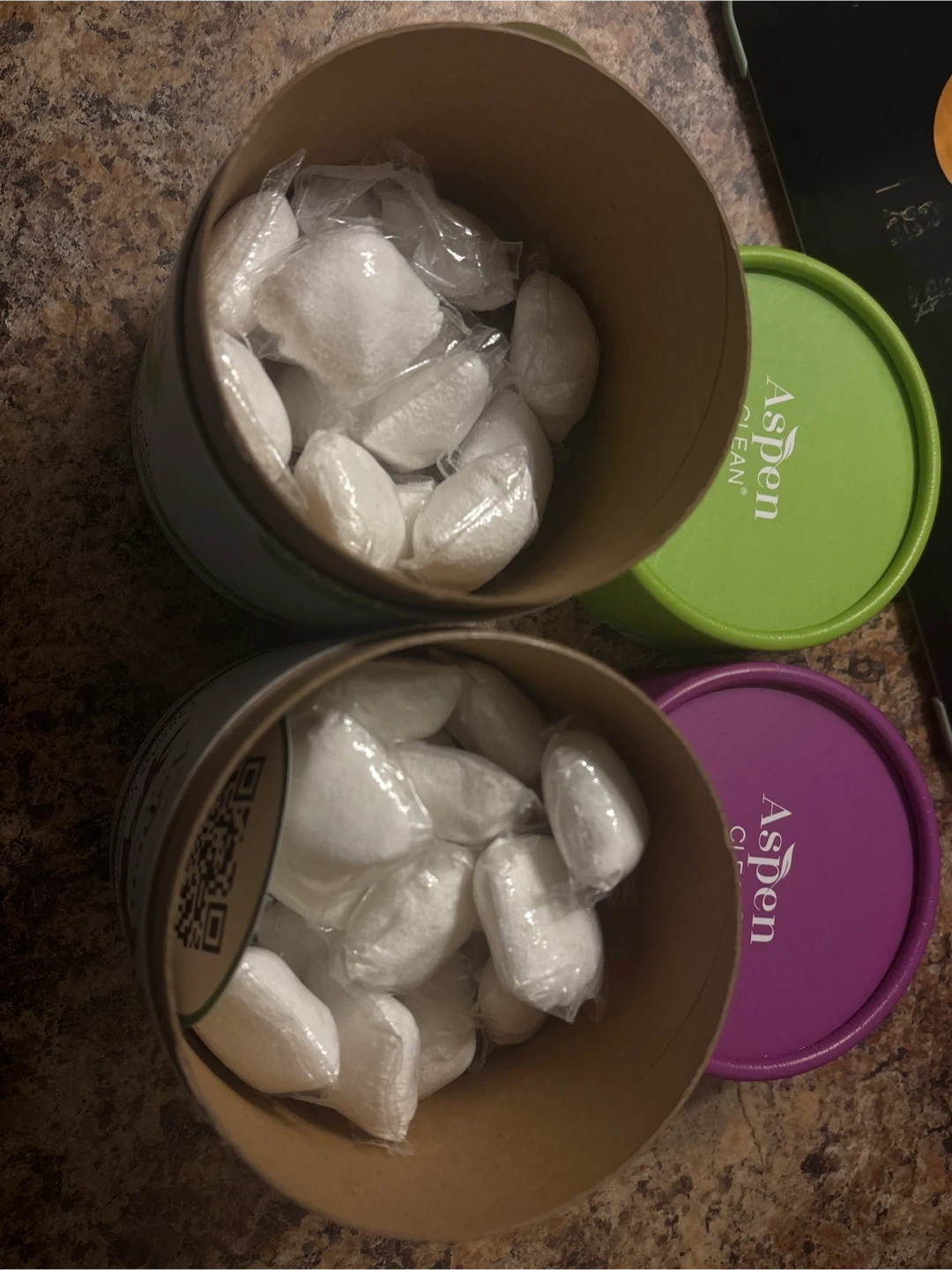 Two canisters of Aspen Clean laundry detergent pods. One is scented with Eucalyptus & Rosemary and the other with Lavender & Lemongrass.