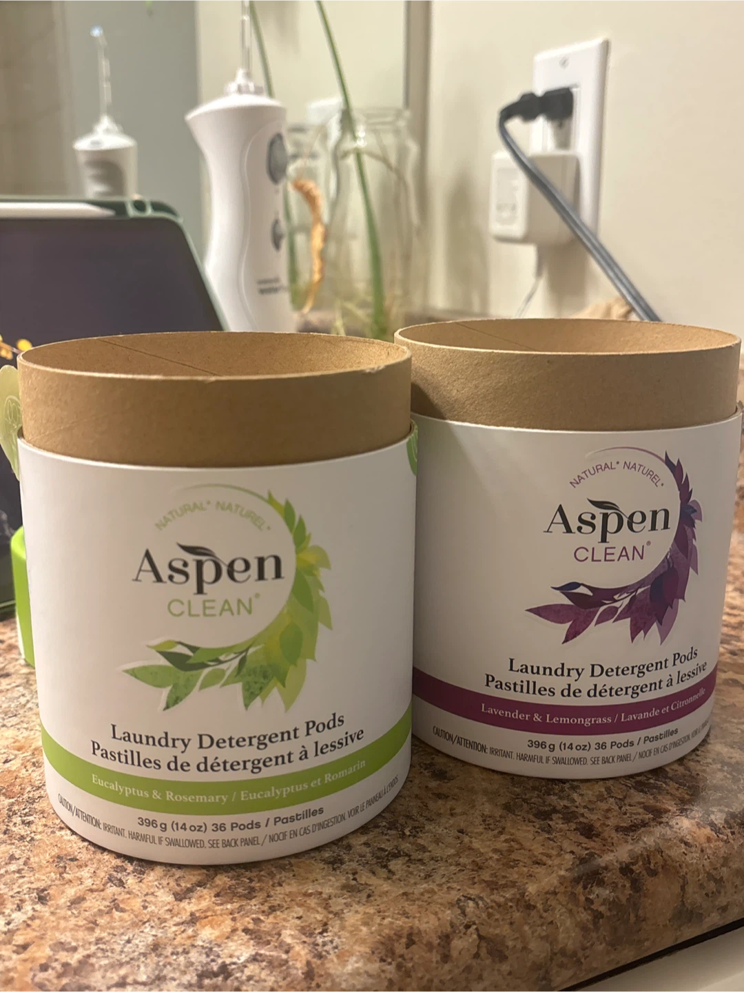 Two canisters of Aspen Clean laundry detergent pods. One is scented with Eucalyptus & Rosemary and the other with Lavender & Lemongrass.