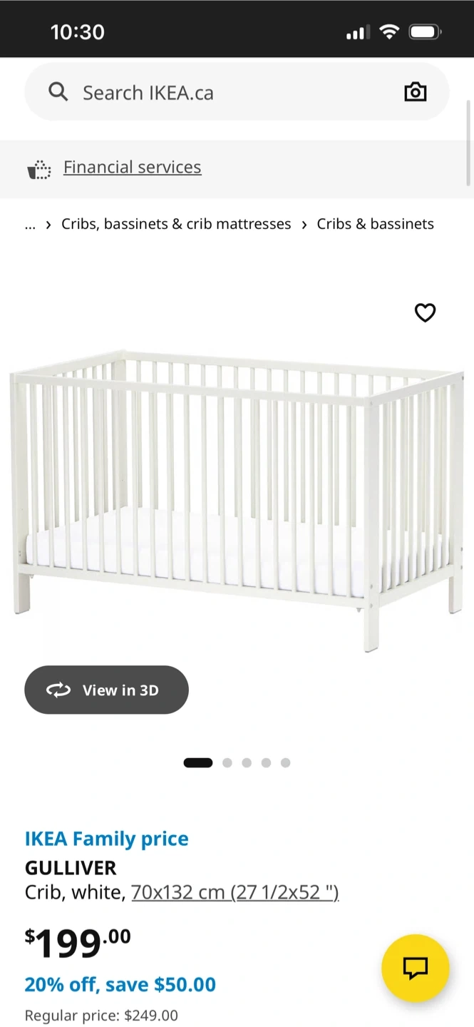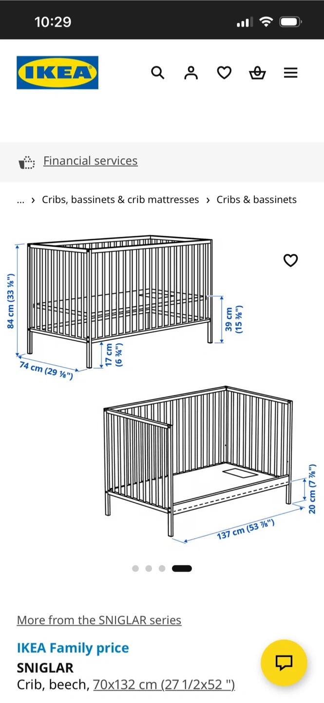 This is an IKEA SNIGLAR crib. It's made of beech wood and measures 70x132 cm (27 1/2x52 "). The crib height is 84 cm (33 1/4 "). It comes with mattress.