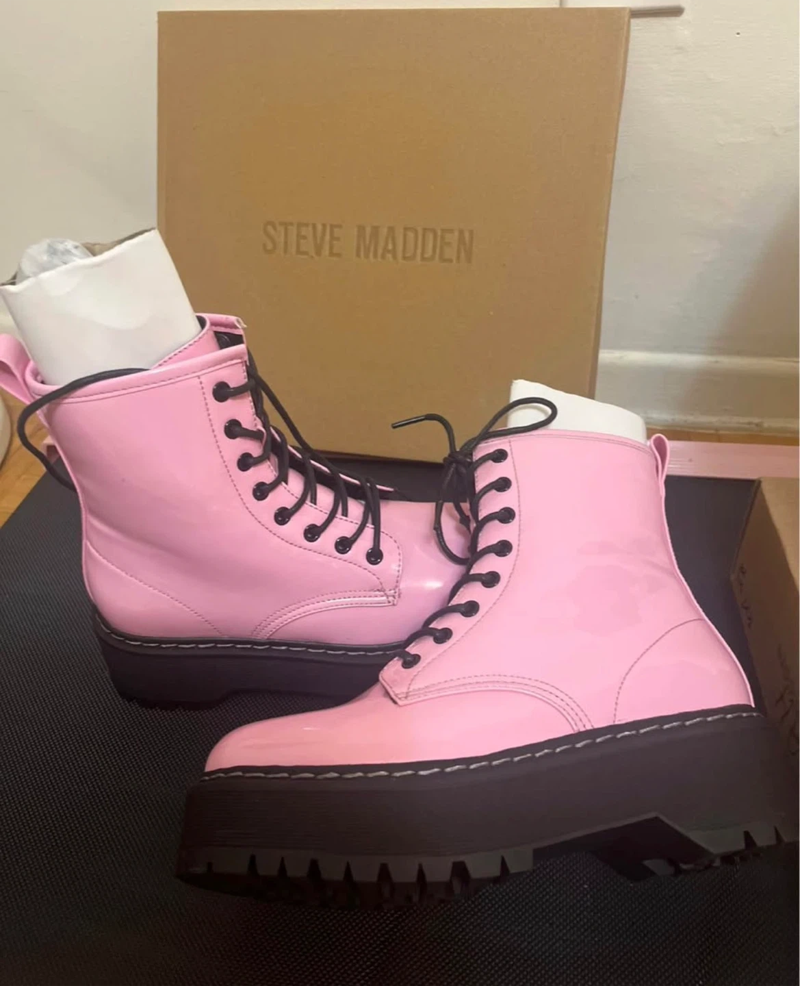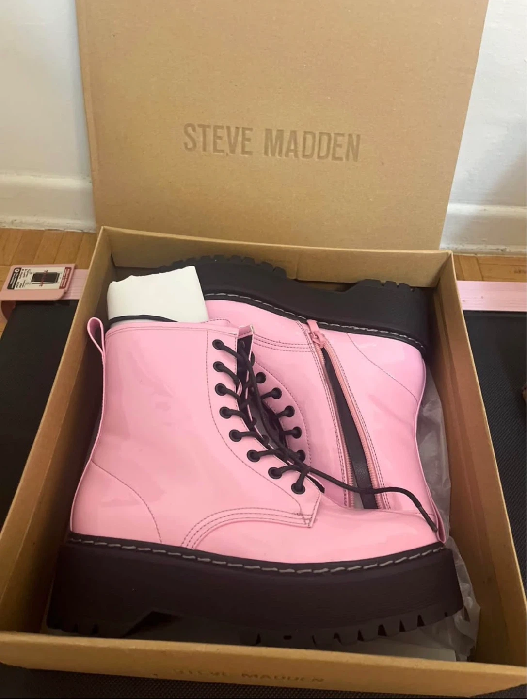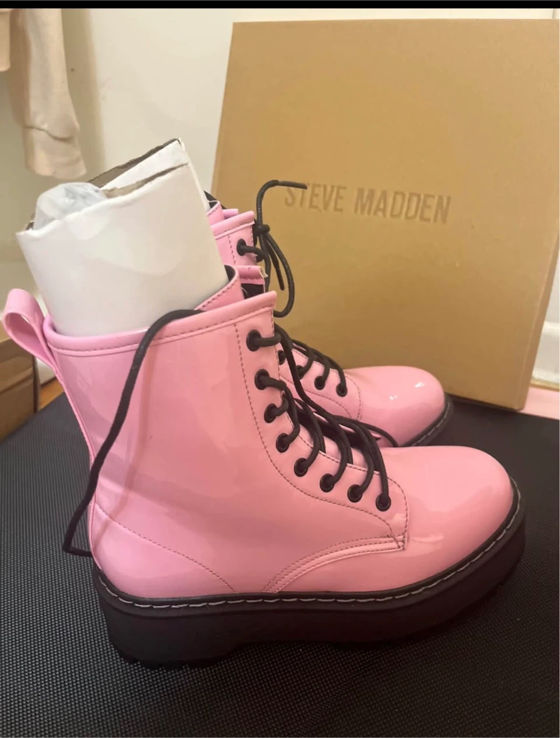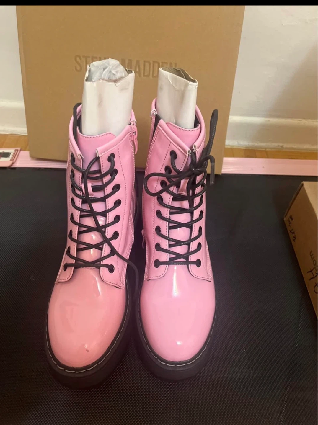 Brand new Steve Madden pink patent leather platform combat boots. Includes original box and packaging. Fits size 6. Originally bought for $130