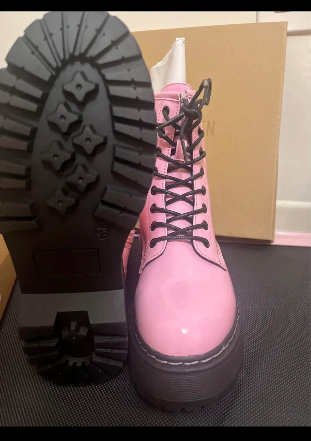 Brand new Steve Madden pink patent leather platform combat boots. Includes original box and packaging. Fits size 6. Originally bought for $130