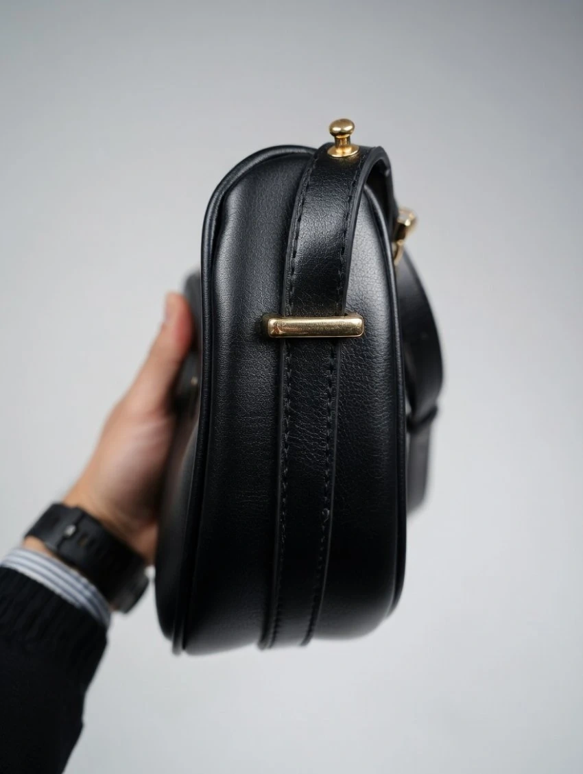 This is a Prada black leather shoulder bag. It's made of leather with gold-tone hardware. The bag features a zip closure and an adjustable strap.