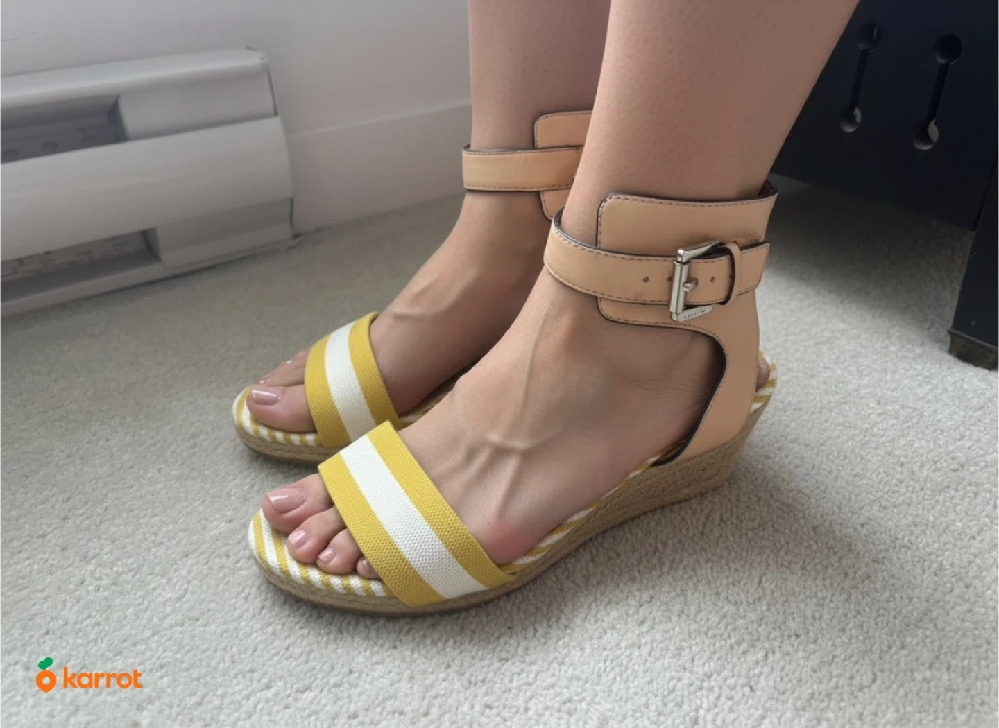 Women's wedges. Yellow and white striped fabric. Tan leather ankle strap with buckle closure. Espadrille wedge sole. Pre-owned.