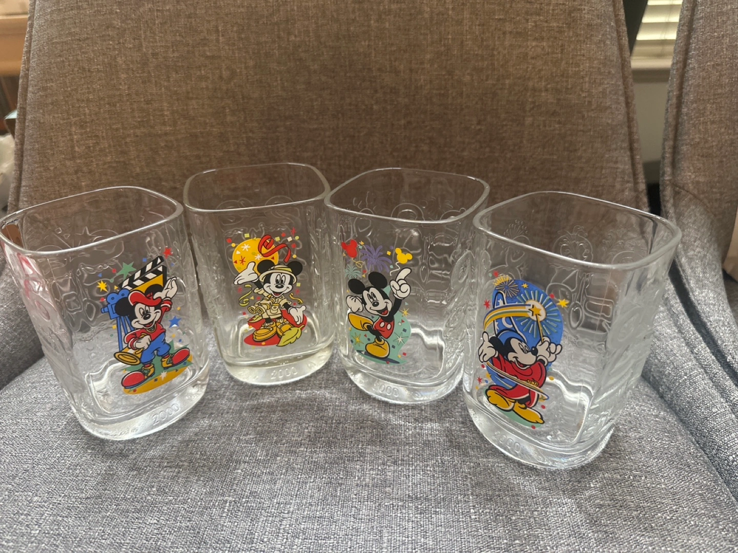 Four clear glasses featuring different images of Mickey Mouse celebrating the year 2000. Square shape. Etched details. $30 OBO