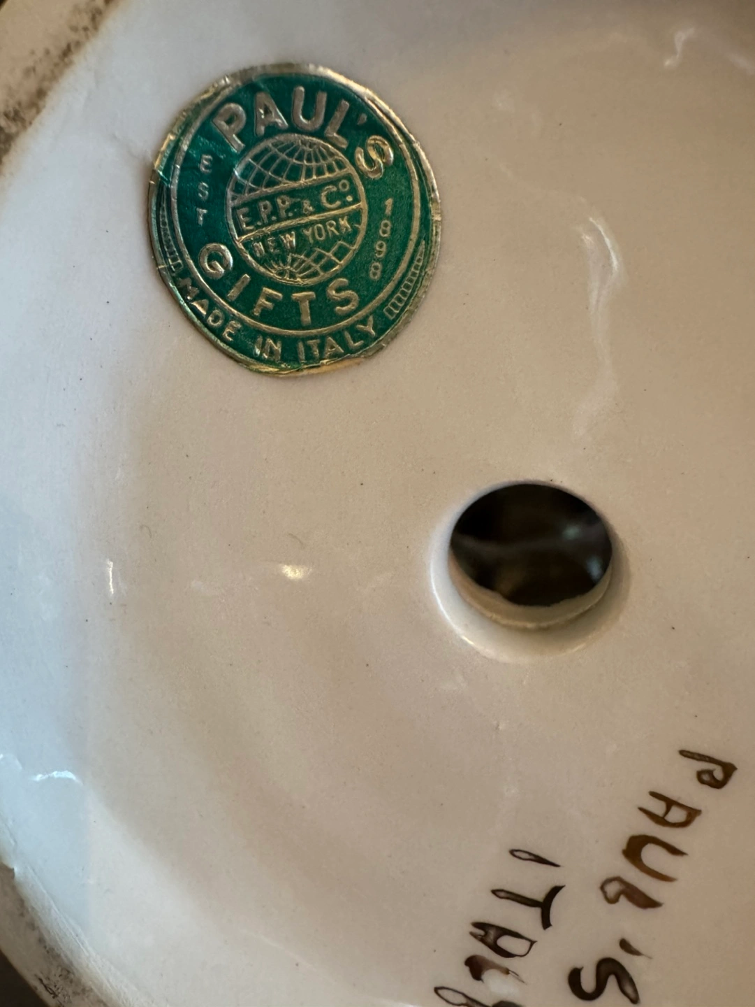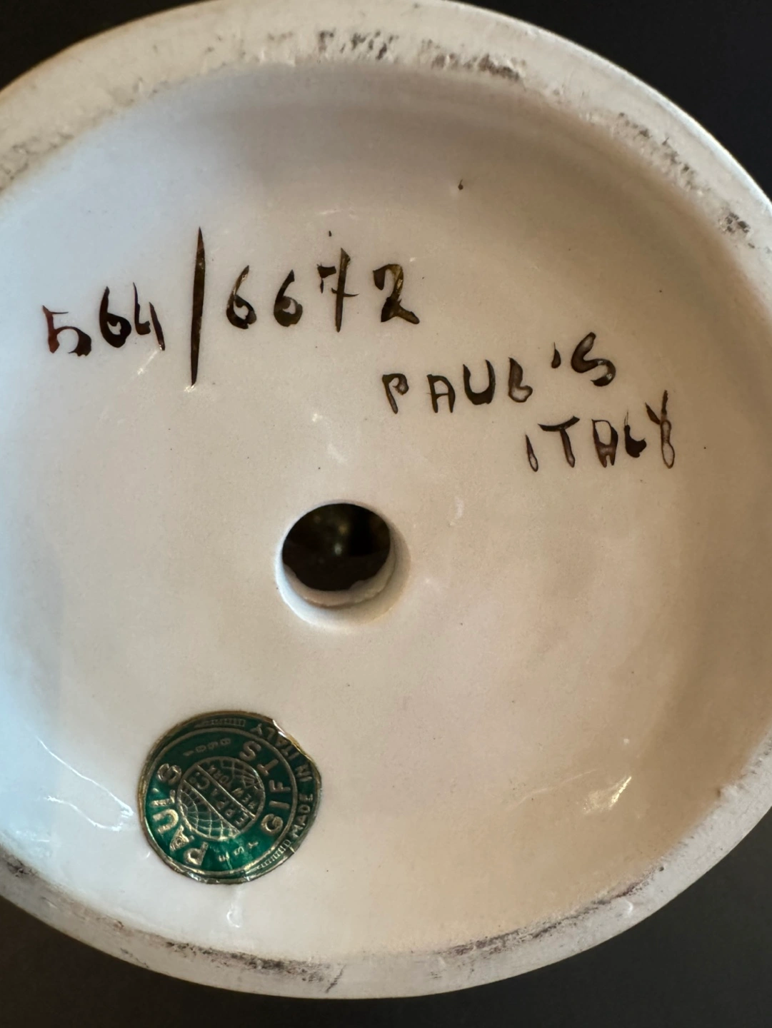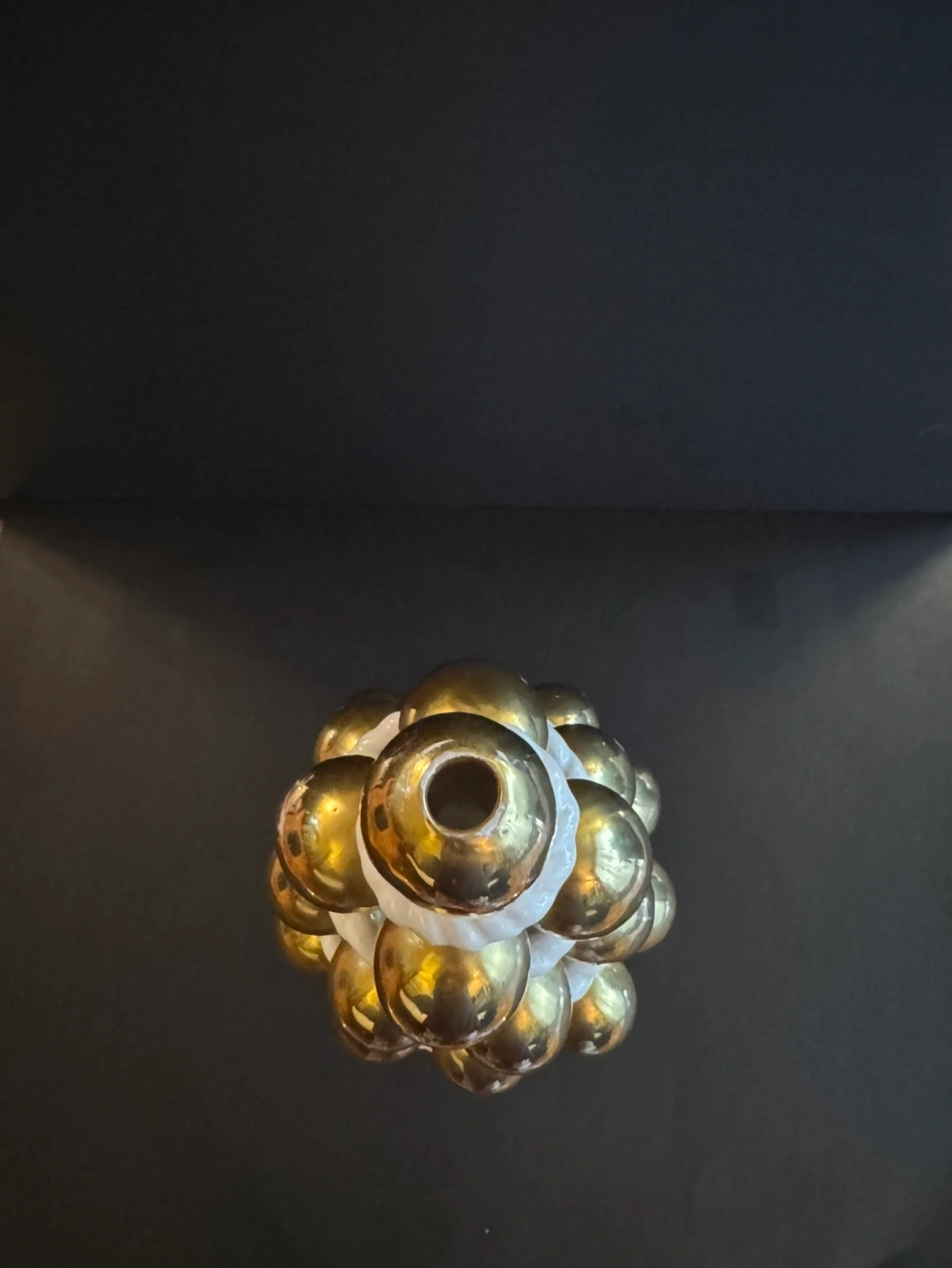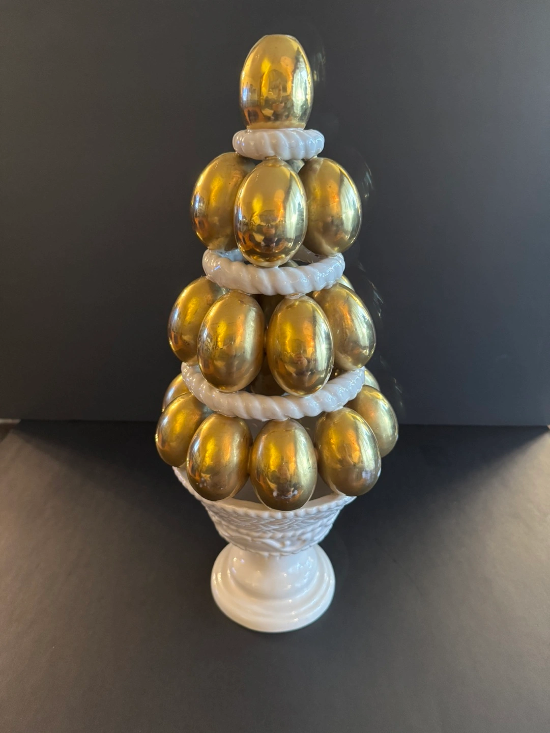 60Unique vintage ceramic centerpiece. Features a tiered design with numerous gold eggs. White ceramic base with ornate detailing. Made in Italy. High 17 inches