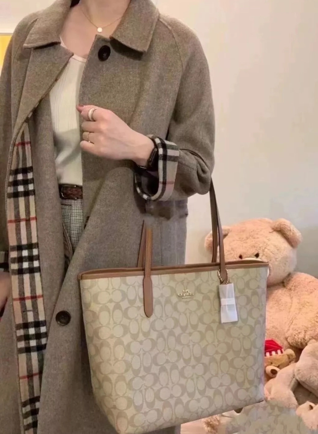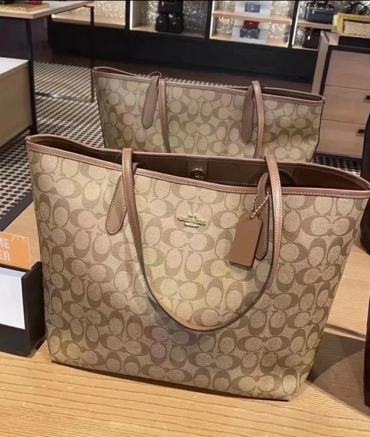 Large tote bag. Beige signature canvas material. Brown leather trim. Top handles. Great for everyday use. Spacious interior.