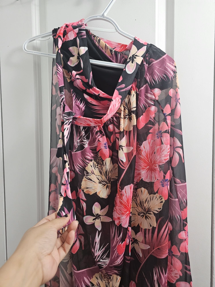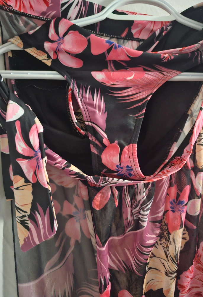 Stunning two-piece swimsuit. Features a vibrant floral print on a black background. Includes a matching sheer cover-up. Perfect for a summer getaway. Pick up only. never been used. Cash preferred.