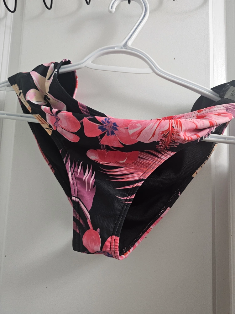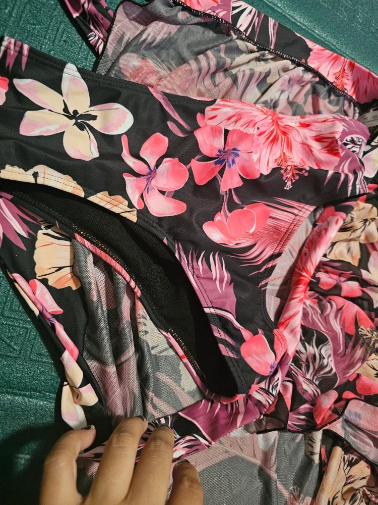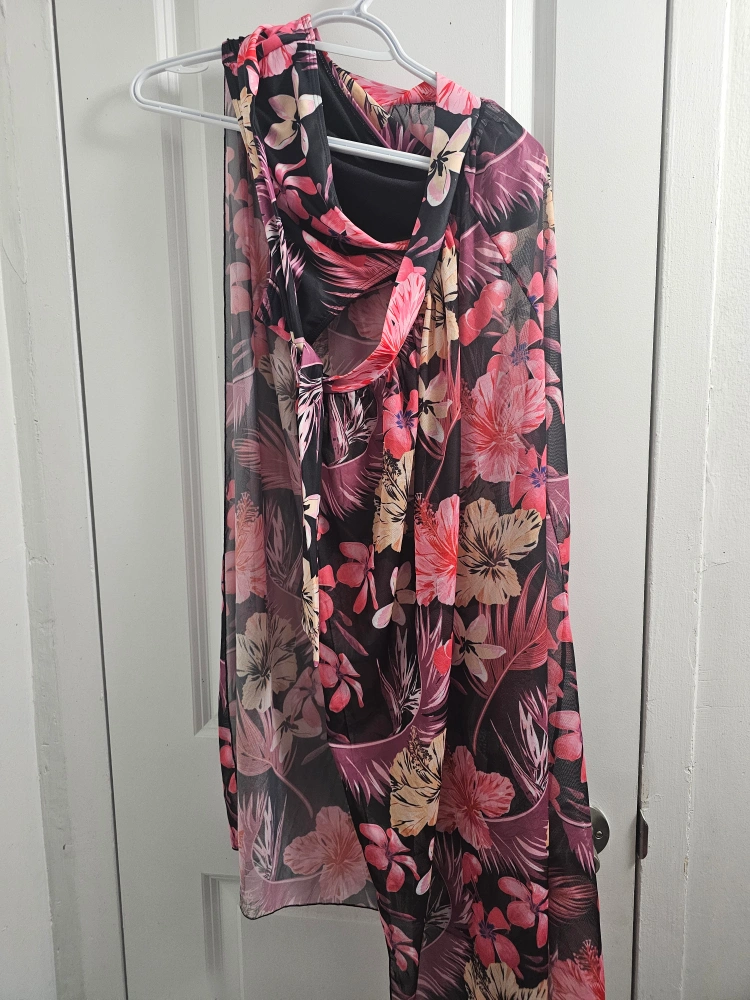 Stunning two-piece swimsuit. Features a vibrant floral print on a black background. Includes a matching sheer cover-up. Perfect for a summer getaway. Pick up only. never been used. Cash preferred.
