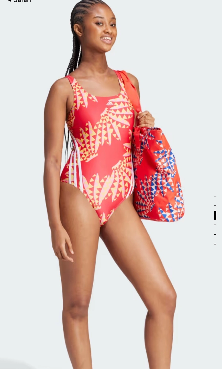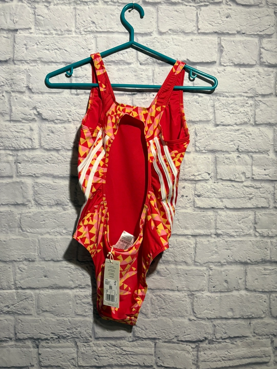 Adidas swimsuit. Red, yellow, and white geometric print. Size 12. Excellent condition. New with tags. Retail is $90. No padding, lined. Pick up only.