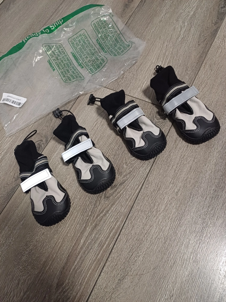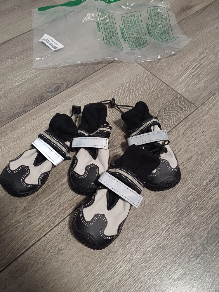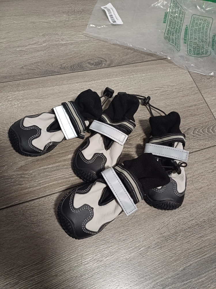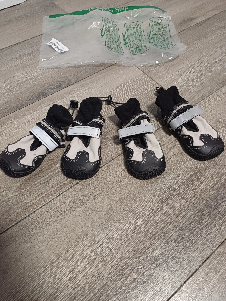 101New dog boots. Four grey and black booties.Size 4; Small to medium size. Easy to put on and take off. Durable soles. Reflective strips. Water proof soles.