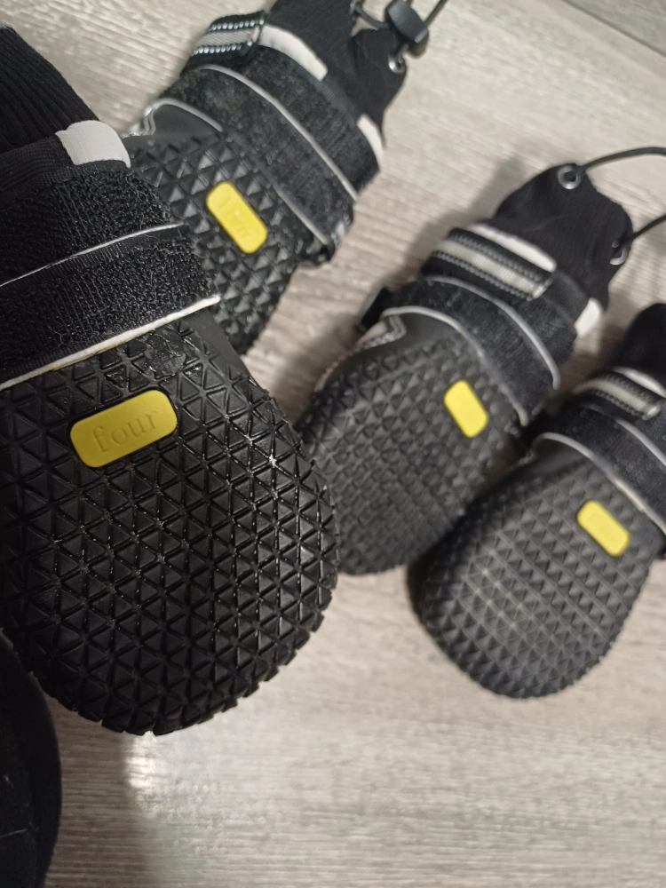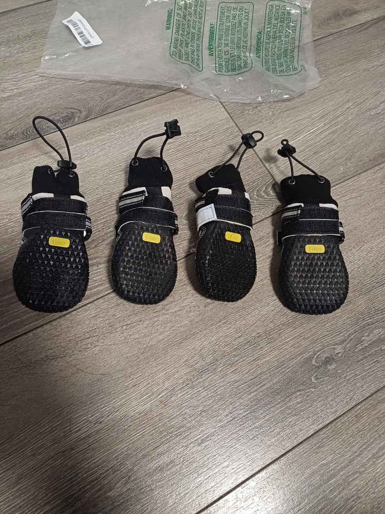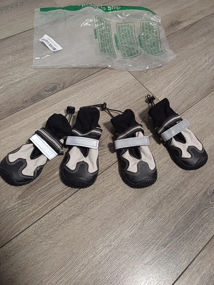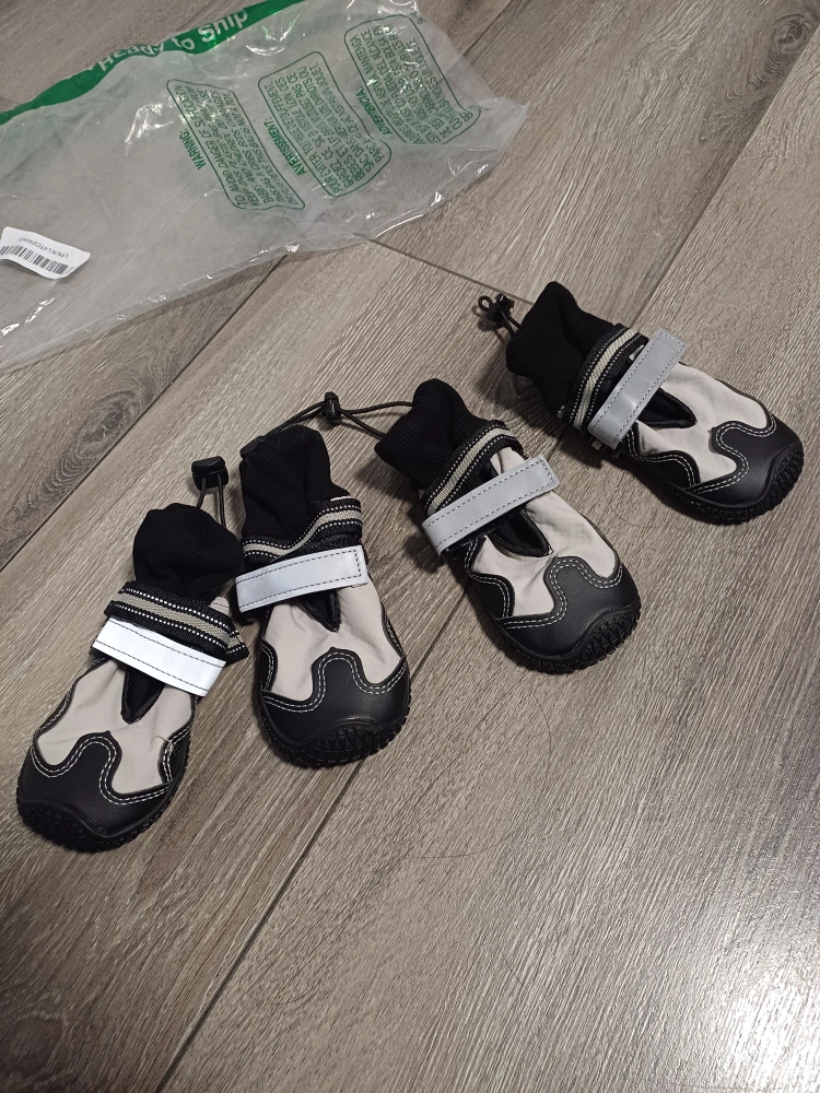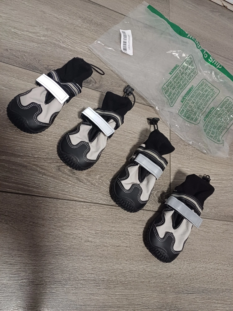 101New dog boots. Four grey and black booties.Size 4; Small to medium size. Easy to put on and take off. Durable soles. Reflective strips. Water proof soles.