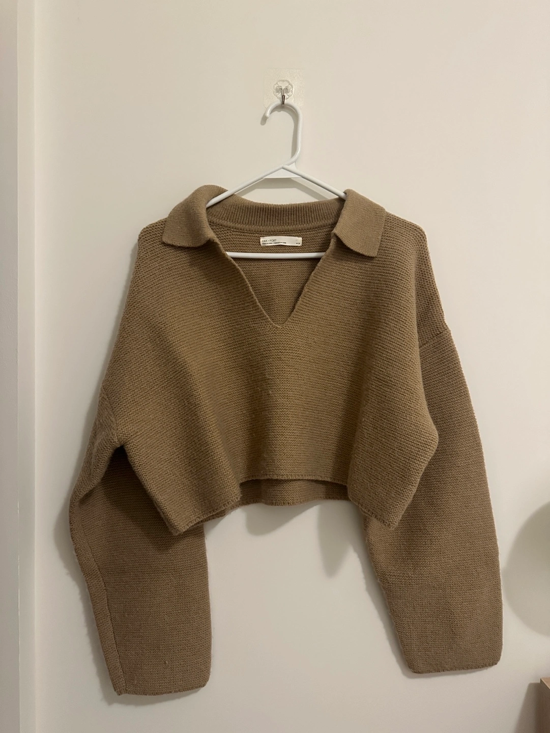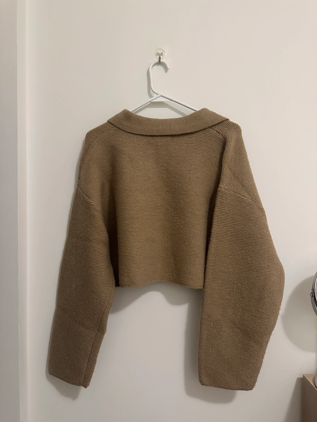 Beige cropped knit sweater. Polo collar. Long sleeves. Relaxed fit. Excellent condition.