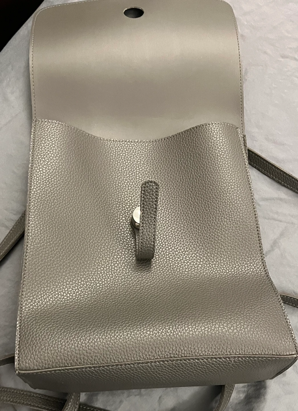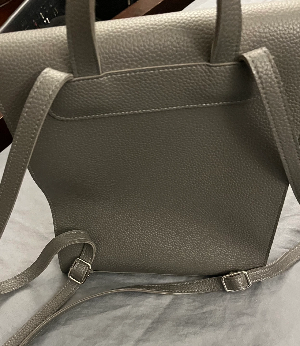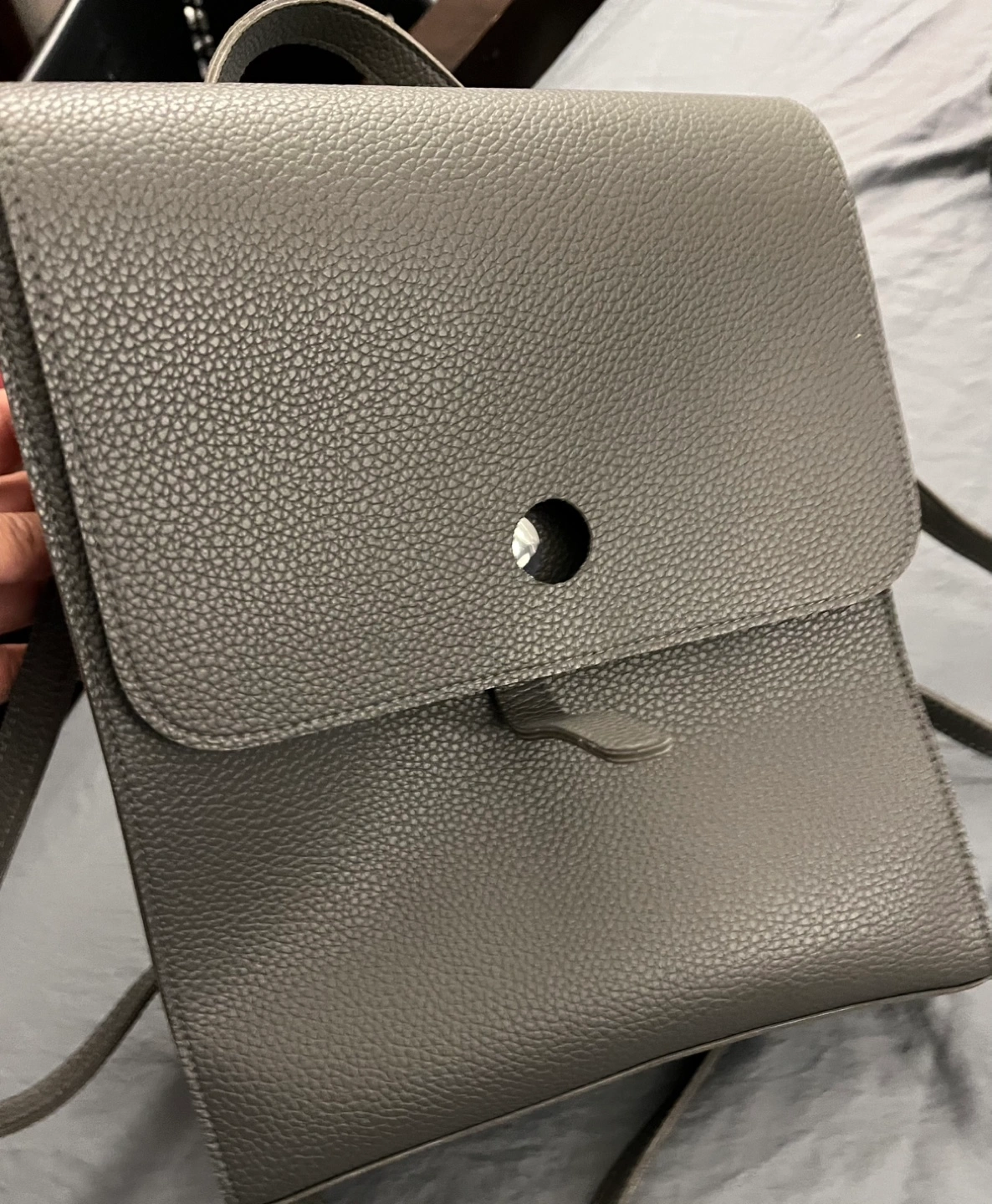 Dark grey pebble-textured faux leather backpack. Adjustable straps. Small, stylish design. Perfect for everyday use.