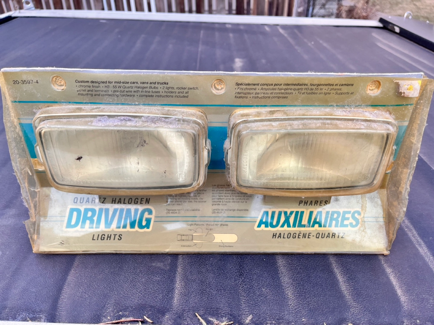 NOS pair of vintage driving lights. Chrome housings. Quartz halogen bulbs. Designed for mid-size cars, vans, and trucks. Wiring and installation instructions included.
