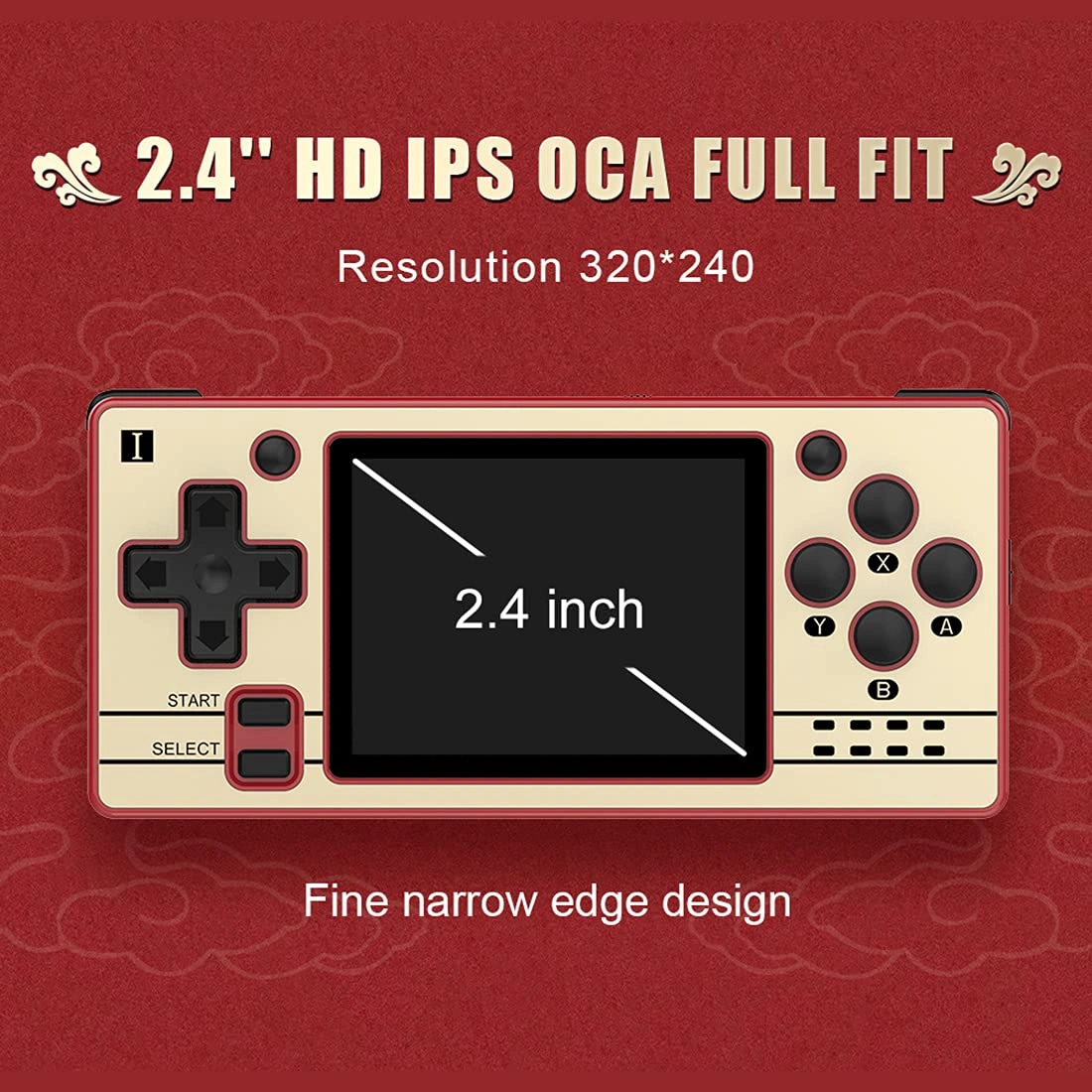 Portable handheld gaming device. Features a 2.4" HD IPS screen. Includes directional pad and action buttons. Power saving speaker. Compact design.