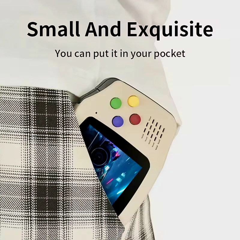 Portable gaming device. Features a 2.8-inch IPS screen with 480x272 pixel resolution. Compact design, fits in your pocket. Includes buttons and directional pad. Type-C charging port.