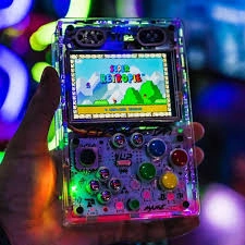 Custom built transparent handheld gaming console. Plays various retro games. Features a clear case, multiple buttons, and a colour screen. Excellent condition.