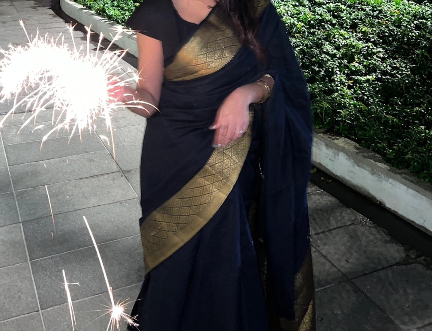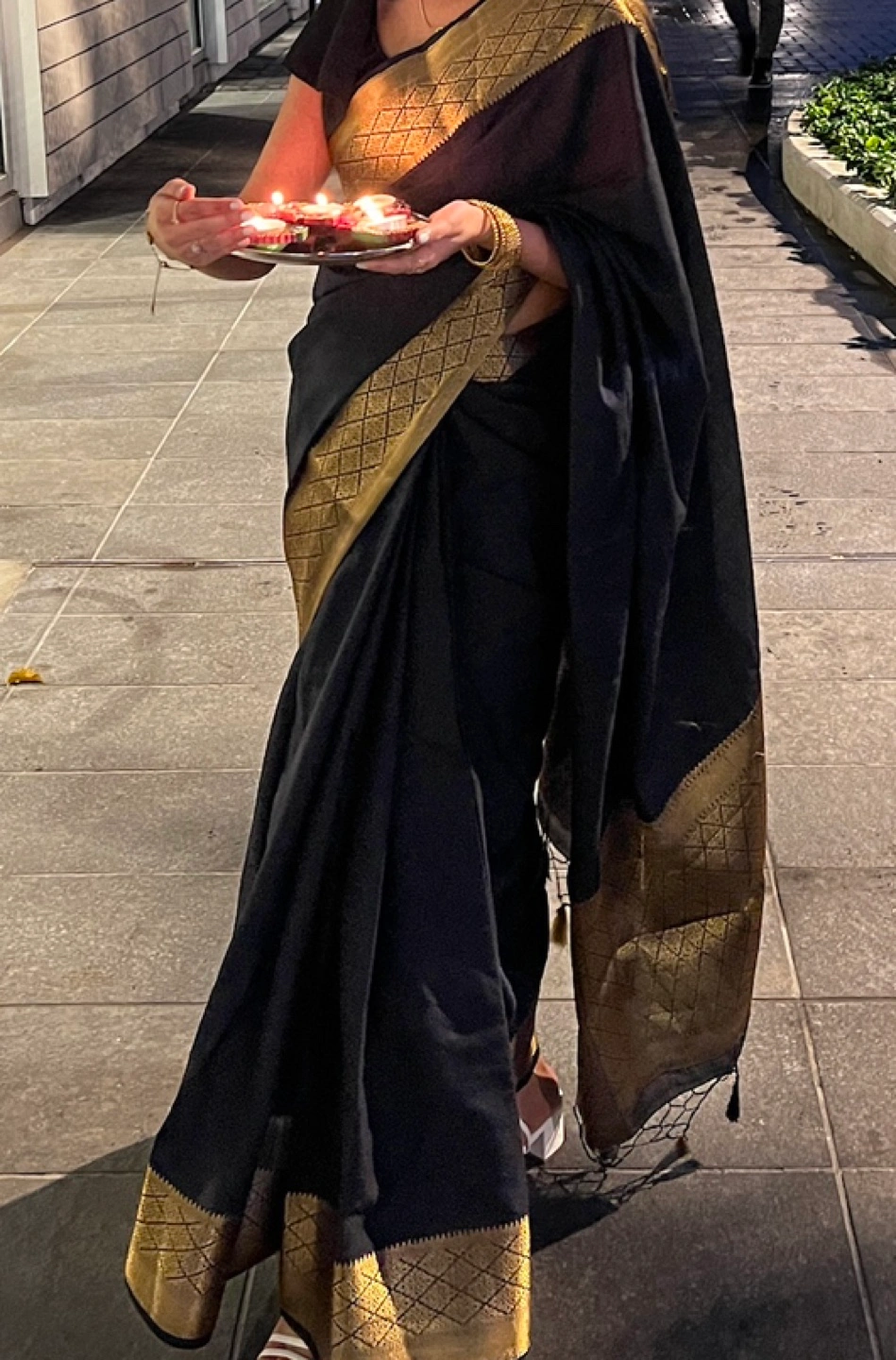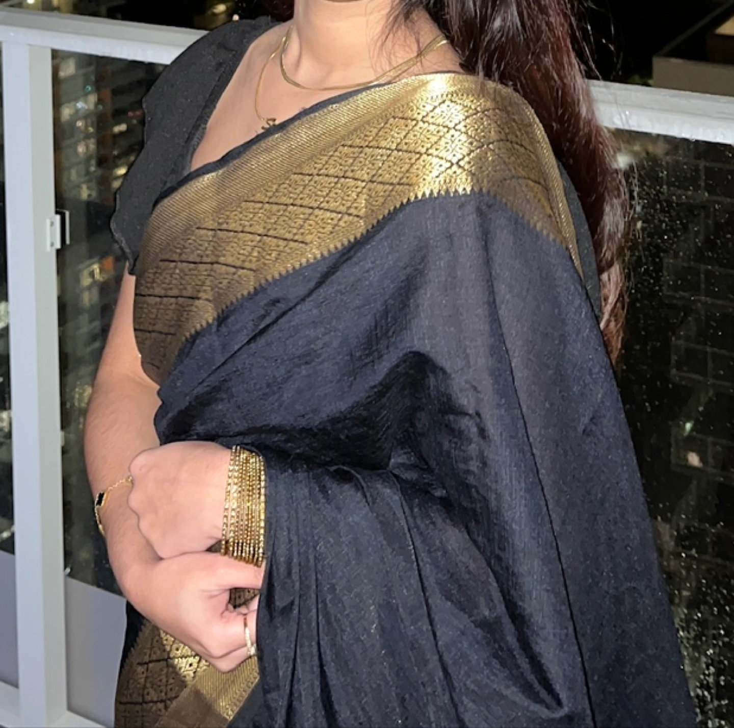 Gorgeous black Banarasi silk saree. Features a stunning gold zari border. Perfect for special occasions. Drapes beautifully. Slight sheen. You won’t regret buying this saree it’s so elegant