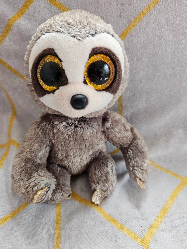 92Adorable Ty Beanie Boos plush toys. One rainbow owl, one brown sloth. Large eyes. Soft and cuddly. Great for kids or collectors.