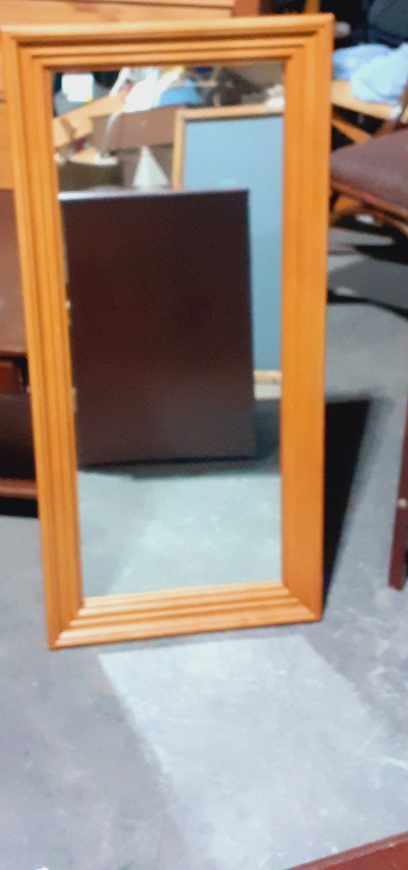 Full-length mirror. Light wood frame. Simple design. Great for a bedroom or hallway.