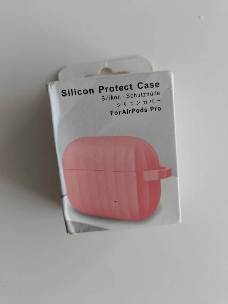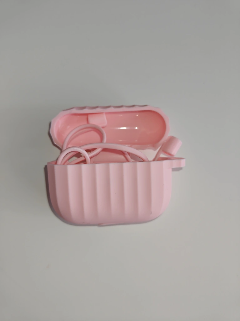 Protective silicone case for AirPods Pro. Soft, pink colour. Ribbed texture. Includes a small carrying loop.