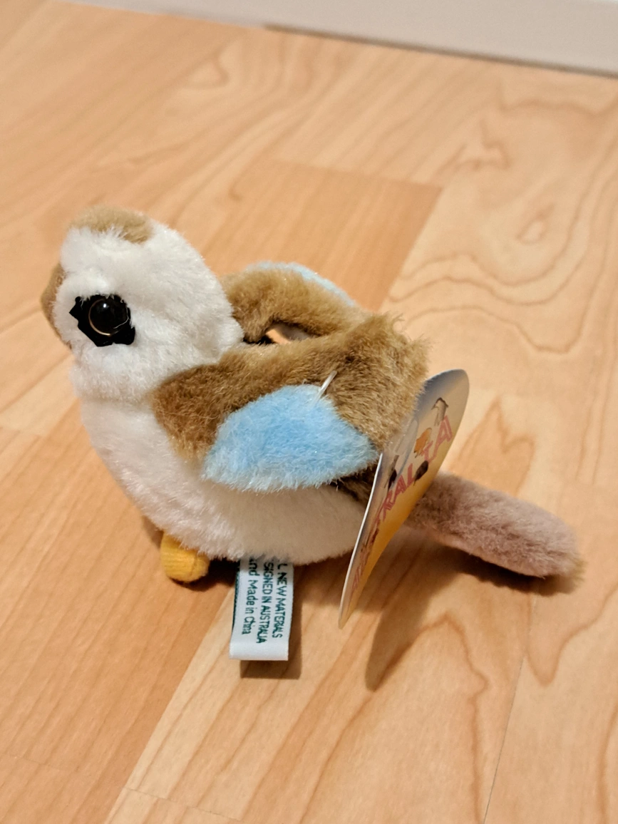 Small, collectible plush kookaburra. Soft, cuddly toy. Features light brown, white and blue colours. Comes with original tag. Made in China.