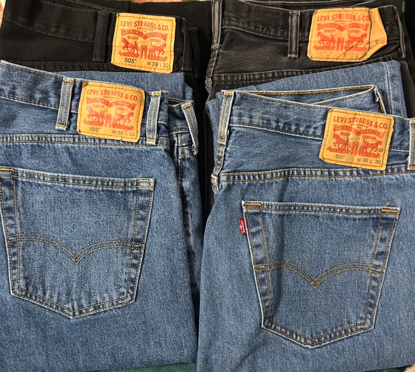 Bundle of four pairs of Levi's jeans. Two pairs of 505s and two pairs of 501s. Various colours and sizes. Check images for details. $80 for all four or $20 each.