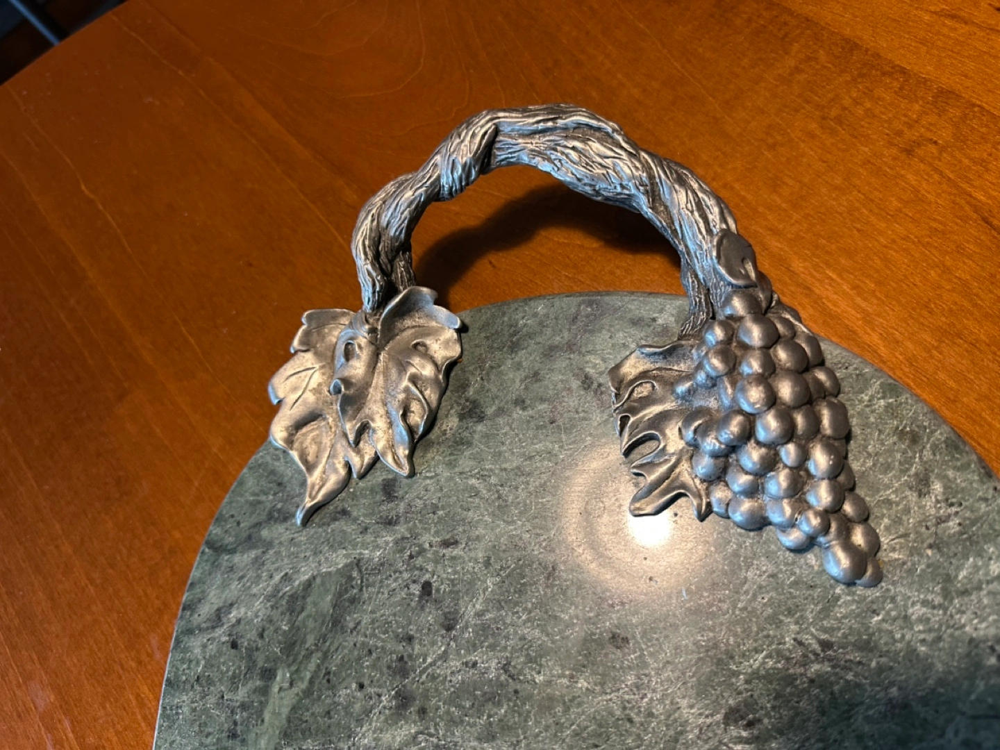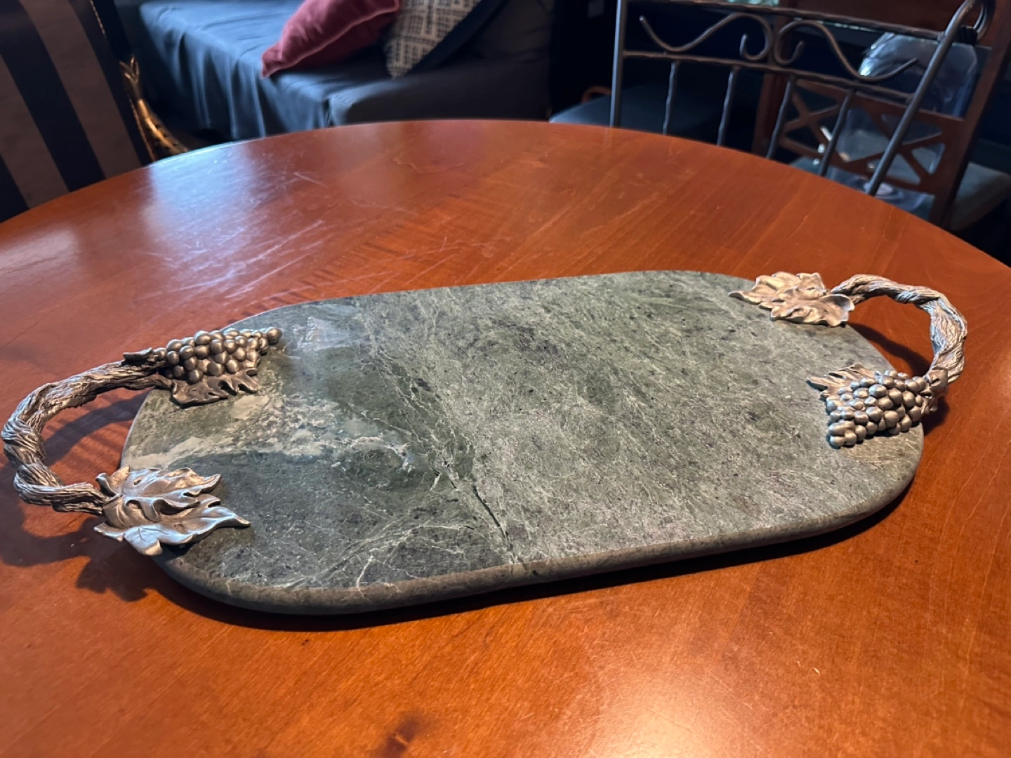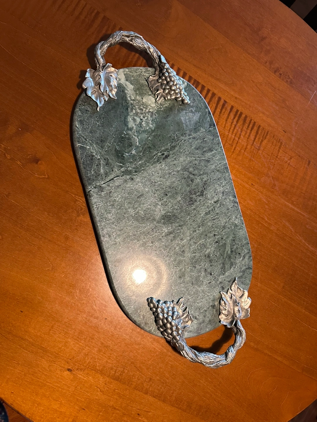 84Green marble serving tray. Features pewter grapevine handles and grape accents. Oval shape. Perfect for cheese, appetizers, or other serving needs.