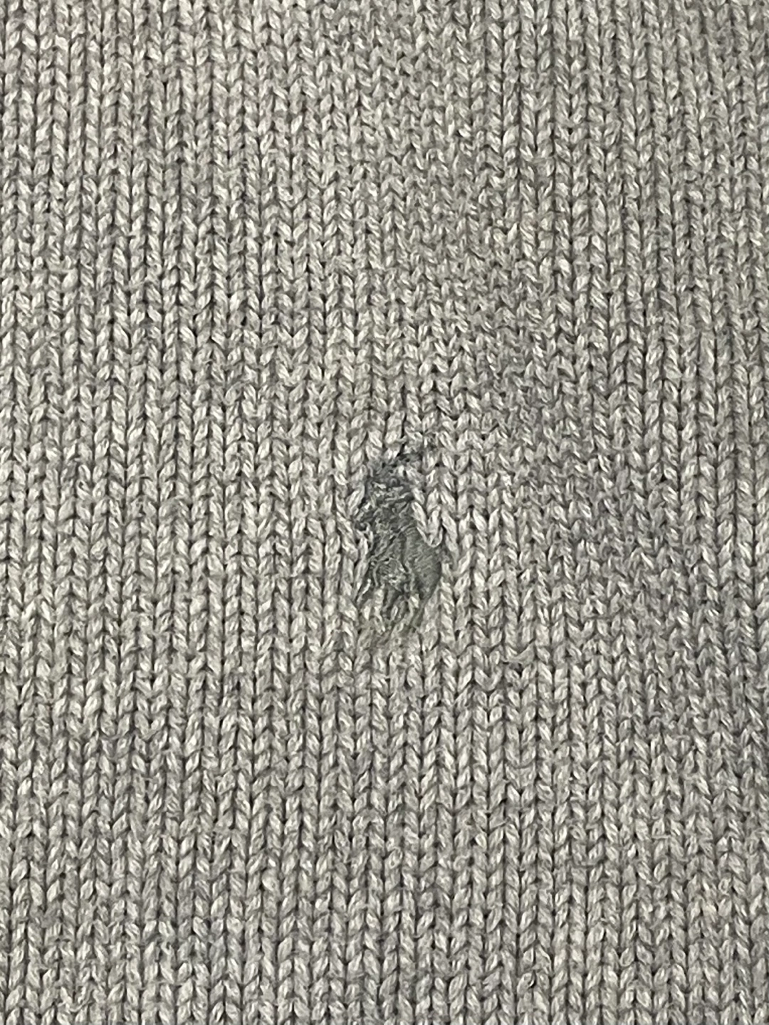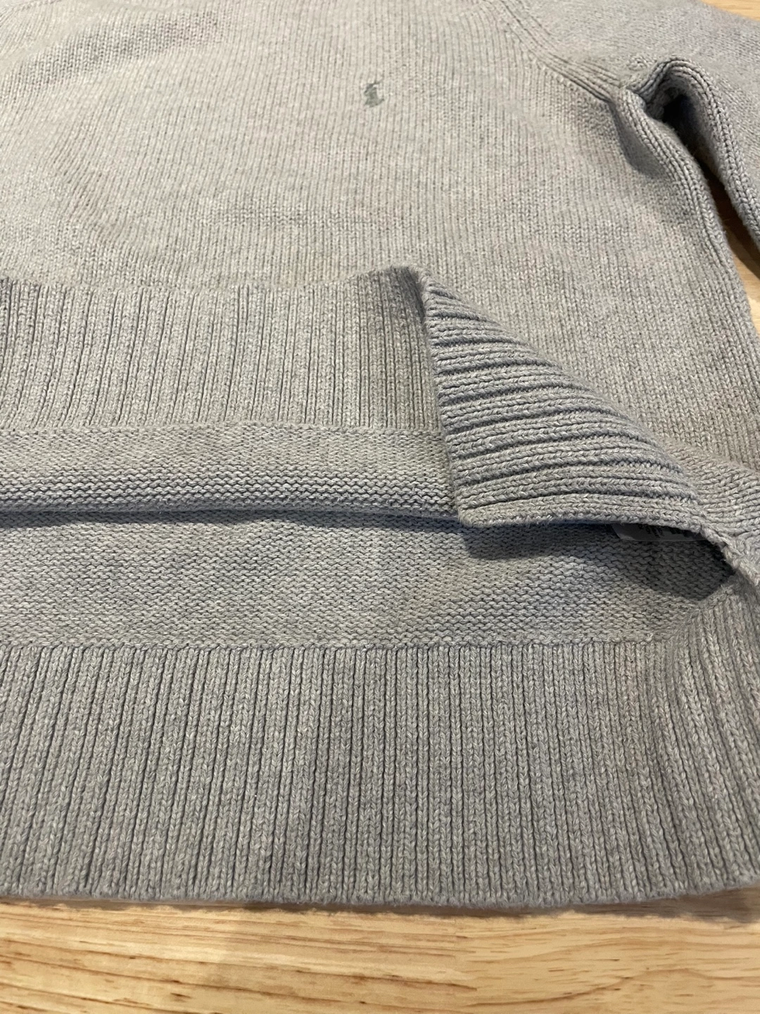 Women's grey Polo Ralph Lauren sweater. Small hole near the center. Long wide sleeves, ribbed cuffs and hem. Crew neck. 100% cotton.