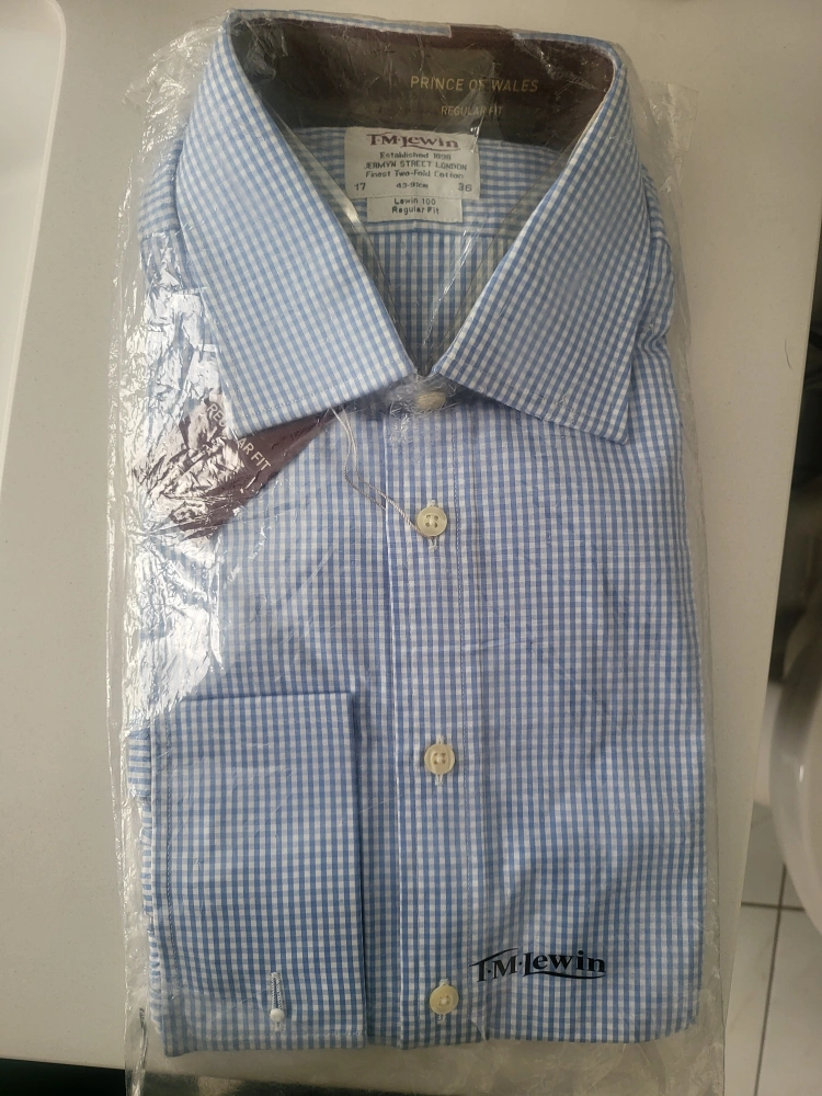 Brand new with tags. Men's dress shirt. Blue and white gingham pattern. Regular fit. Lewin 100. Finest two-fold cotton. Size 17-36.