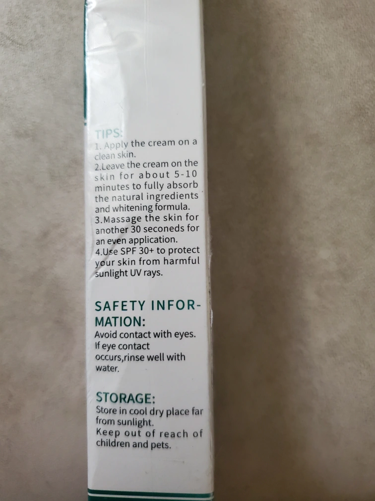 Whitening freckle cream. Removes spots, cleans and whitens skin. Softens delicate skin. Reduces appearance of dark spots. Brightens and smooths skin's surface. Net WT. 1.06 fl oz/30g. Ingredients listed on box. Apply to clean skin, leave for 5-10 minutes, massage for another 30 seconds. Use SPF 30+. Avoid contact with eyes. Clearing out my storage closet from stuff For pick up only