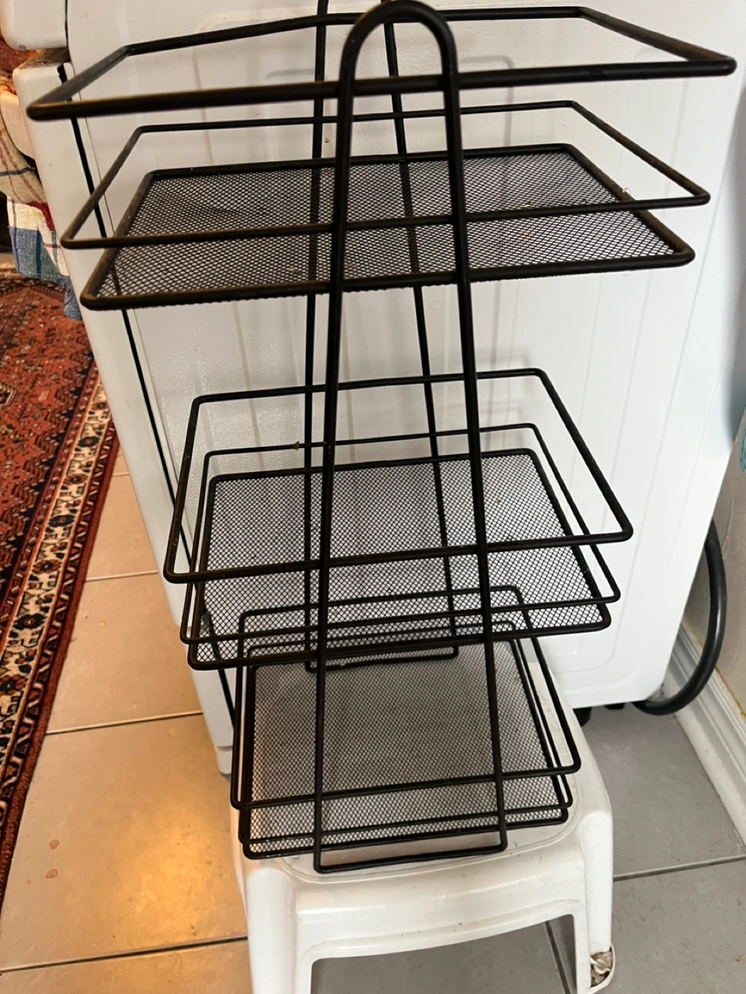Three-tiered metal storage organizer. Black wire shelving. Ideal for kitchen, bathroom, or office. Compact and functional.