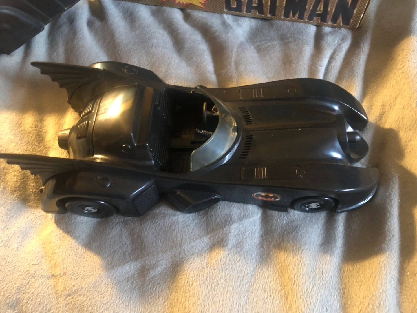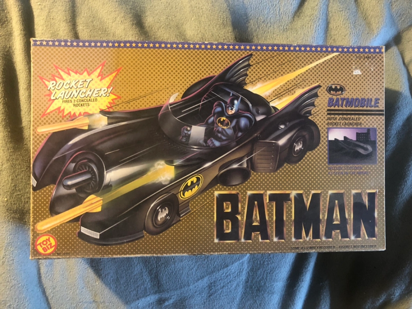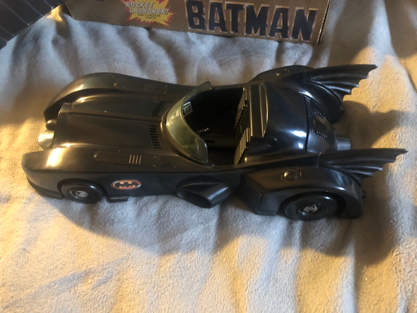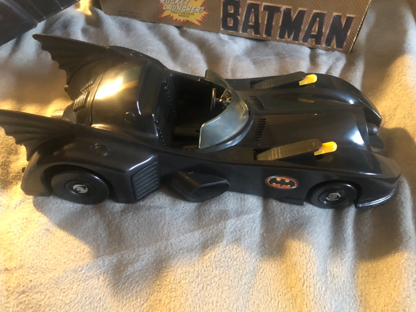 Tim Burton’s Batmobile 100% complete vintage 1989 from Toybiz with missles that still fire, “shell” (repainted in matte black cuz it looked cooler lol) and original box. Includes Batman ‘89, Robin ‘89, Joker ‘89, Batman ‘92, attack penguins ‘92.